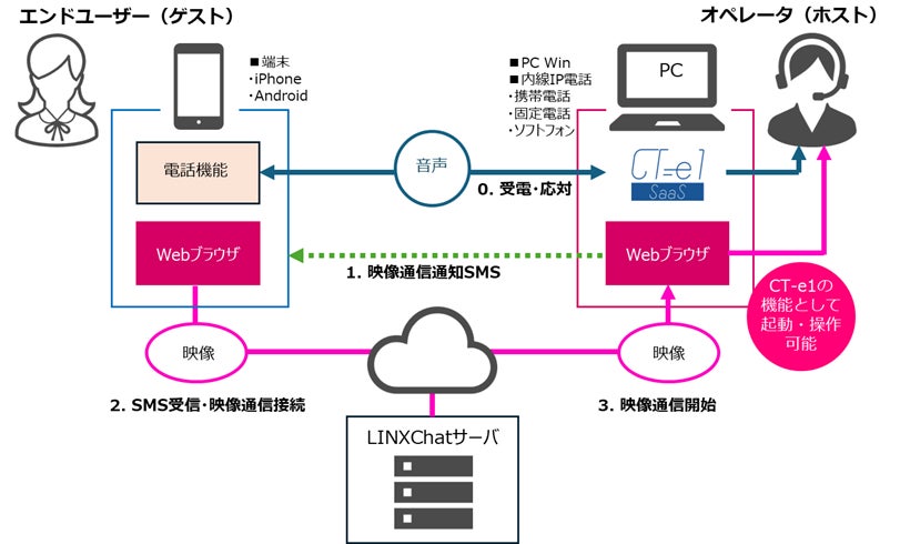 オペレーターとお客様は「CT-e1/SaaS」上で音声通話を行いながら、お客様の携帯電話番号へSMS(ショートメッセージ)で映像通信専用のURLを送信。「LINX Chat」(Webブラウザ)で映像の共有を行います。