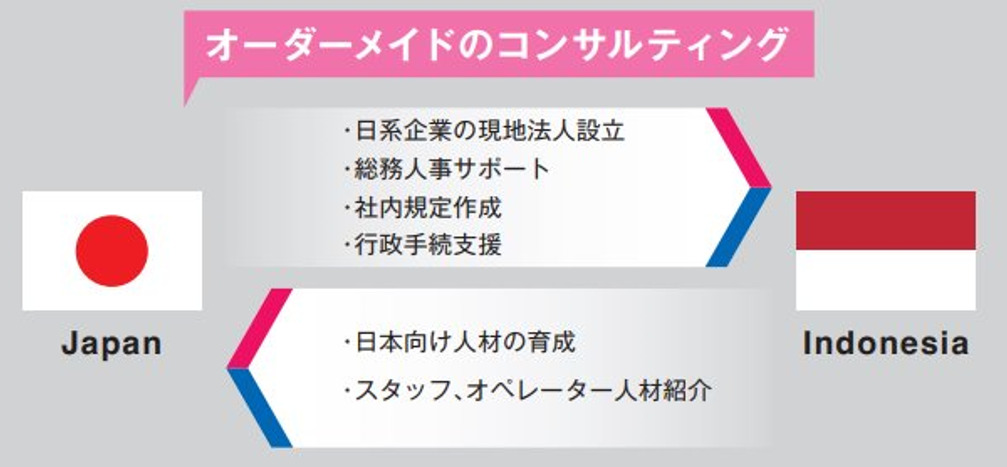 インドネシアにおける日系コンサルティング会社の草分けとして、1998年1月に首都ジャカルタで誕生。 創業以来、躍動するインドネシアのビジネスシーンの第一線で、会社設立(許認可申請代行)、労働問題、労務制度構築など、人事・総務の面で日系企業をサポート。