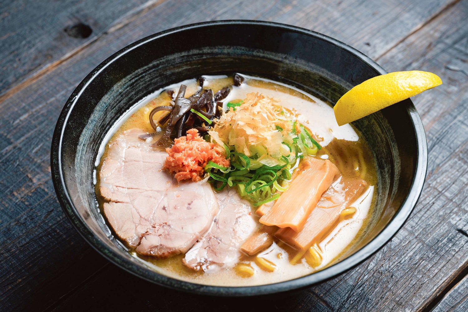 素材の旨味を凝縮したスープに風味豊かな鮭だしを加えることで、パンチのある味わいに。トッピングには鮭の風味をさらに高める鮭フレークのほか柔らかなチャーシューなどを添えてます。お好みでレモンを搾ると、さっぱりとした風味に!