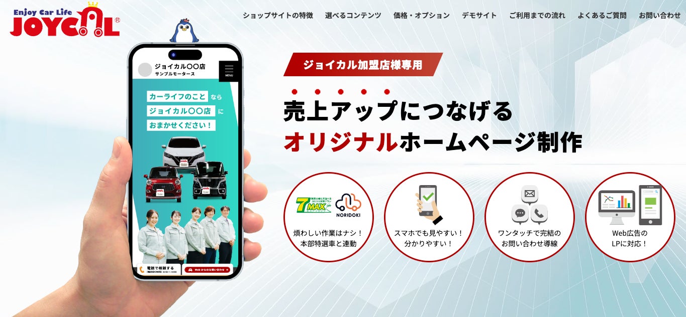 また、ジョイカル加盟店様から聞かれる「ホームページは作ったものの、更新する作業時間が取れない・・。」といったお悩みにお応えし、本部特選車情報が常に自動更新されるなど、ホームページに必要な「欲しい!」情報を備えたサービスも開始しました。