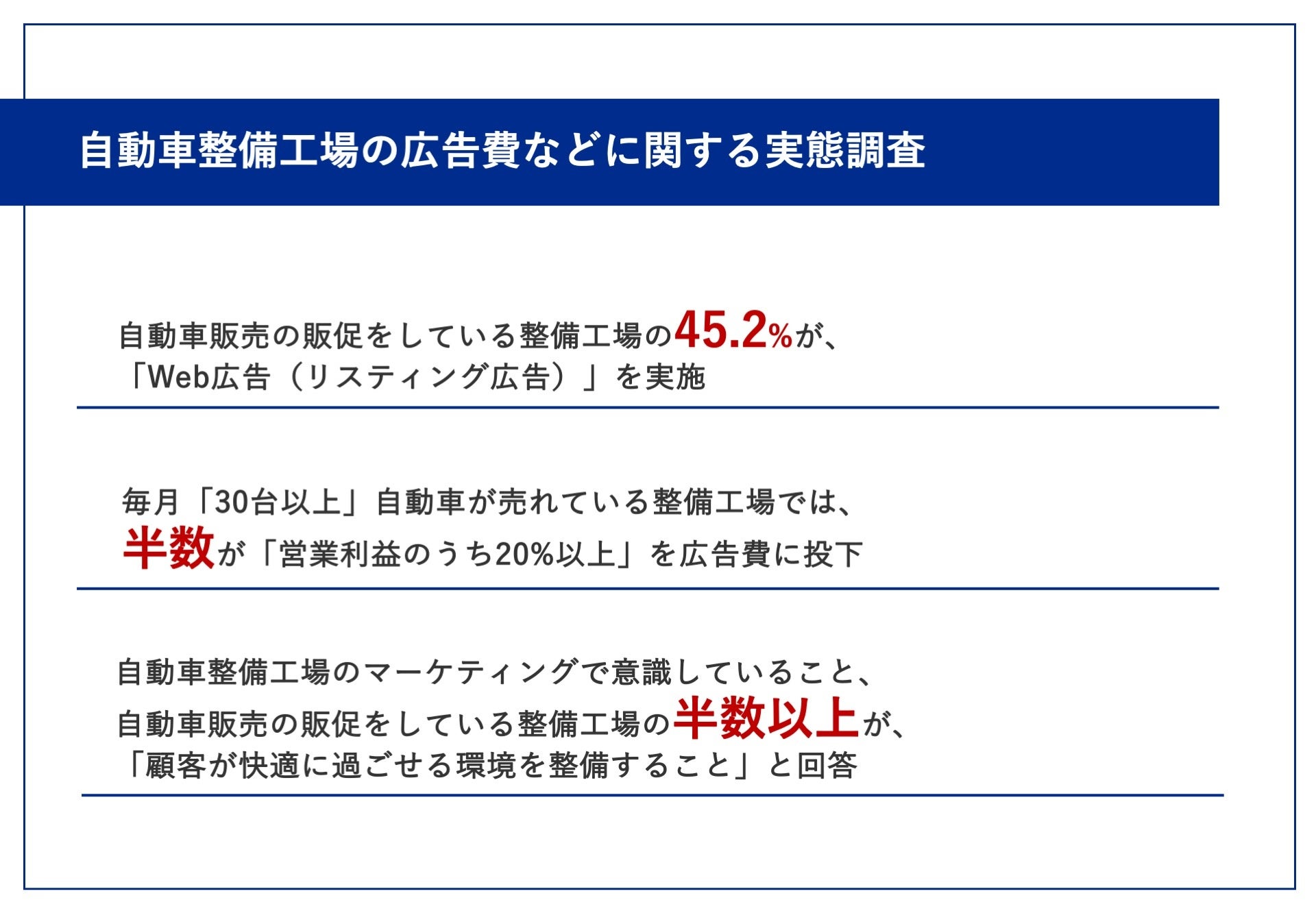 今回は、自動車を販売している整備工場の代表取締役・役員89名を対象に、自動車整備工場の広告費などに関する実態調査を実施しました。