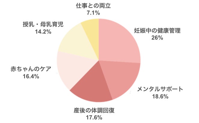 妊婦の関心は、妊娠期の体調管理やメンタルケアに高く集中する一方で、産前・産後ケアや赤ちゃんのお世話、授乳支援にも強い関心があることが明らかになりました。妊娠から産後まで、身体・心・育児に関わる多面的な課題に早期かつ継続的に寄り添う支援のニーズが浮き彫りになっています。