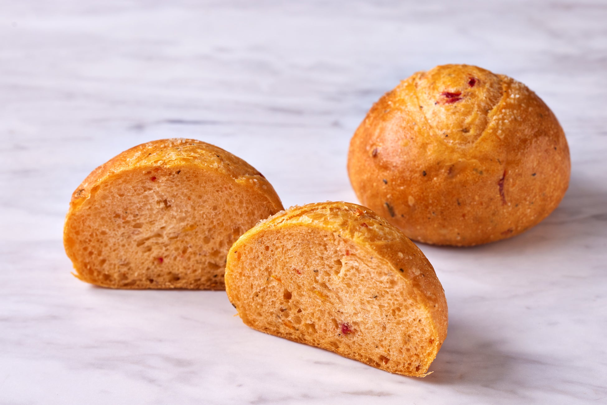 【商品詳細】ドライトマトをパン生地に混ぜて焼き上げた食事パン。2 種類の小麦粉を使用し、歯切れの良いモチモチ食感に仕上げました。 動物由来の食材を使用しないヴィーガンブレッドです。
