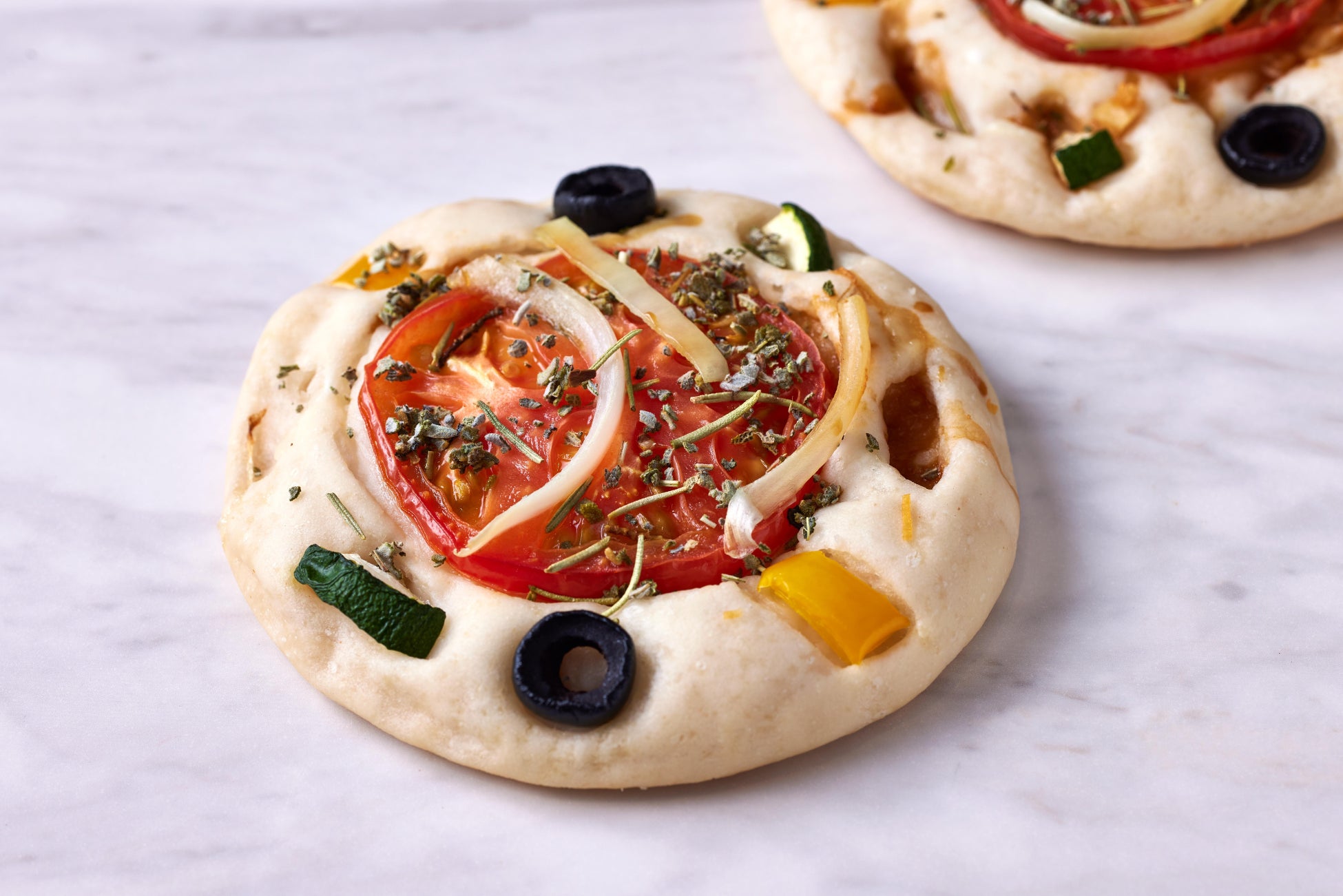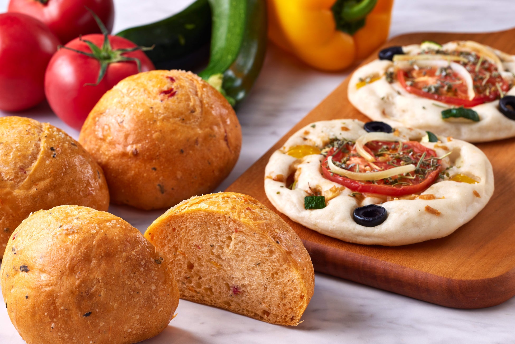 【商品詳細】米粉で作った生地に 4 種の夏野菜をトッピングして焼き上げたヴィーガンフォカッチャ。ガーリックオイルと焦がし醤油の香り が食欲をそそります。