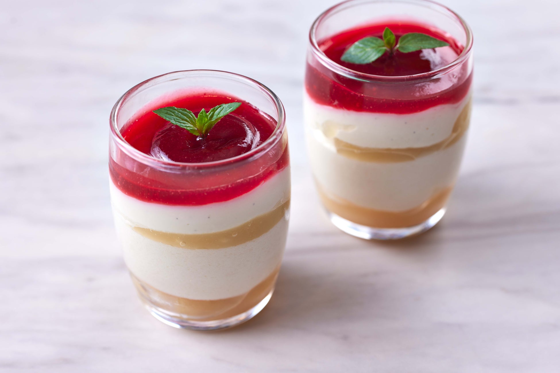 【商品詳細】ピーチメルバをイメージしたグラスデザート。 桃とホワイトチョコクリーム、フランボワーズソースを重ねアクセントにアーモンドのプラリネットを加えた夏らしい スイーツ。