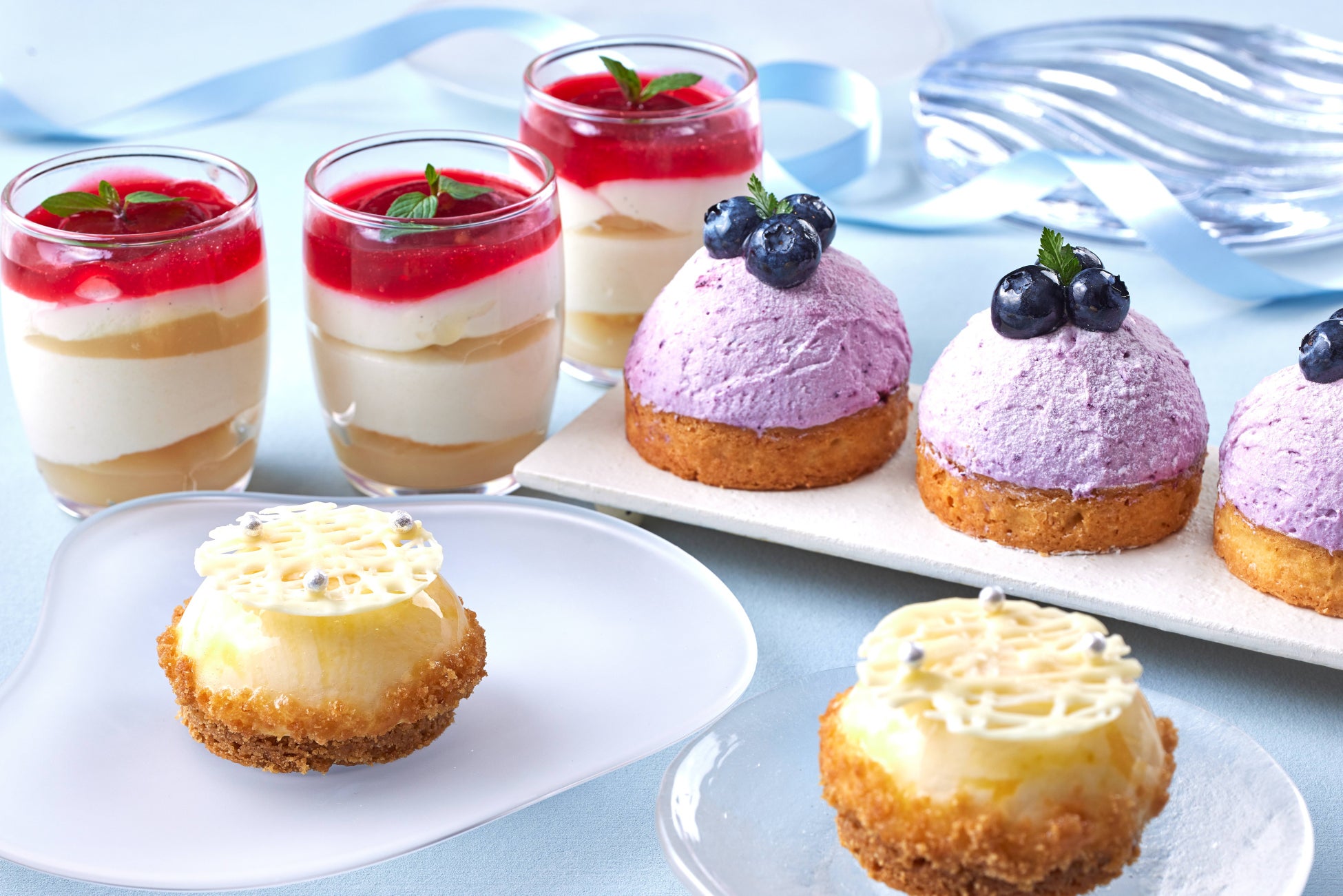 富士屋ホテルでは、リゾートホテルならではの季節感を大切にした商品を販売しております。箱根の紫陽花をイメージしたブルーベリーのケーキや桃、ライチを使った涼やかなケーキで夏を演出します。ベーカリーは社内で開催したパンコンクールから生まれたヴィーガンブレッドをベースに、販売に向けて更に改良を重ねました。お土産にも、またイートインスペースで夏の箱根観光のひとときにご賞味ください。