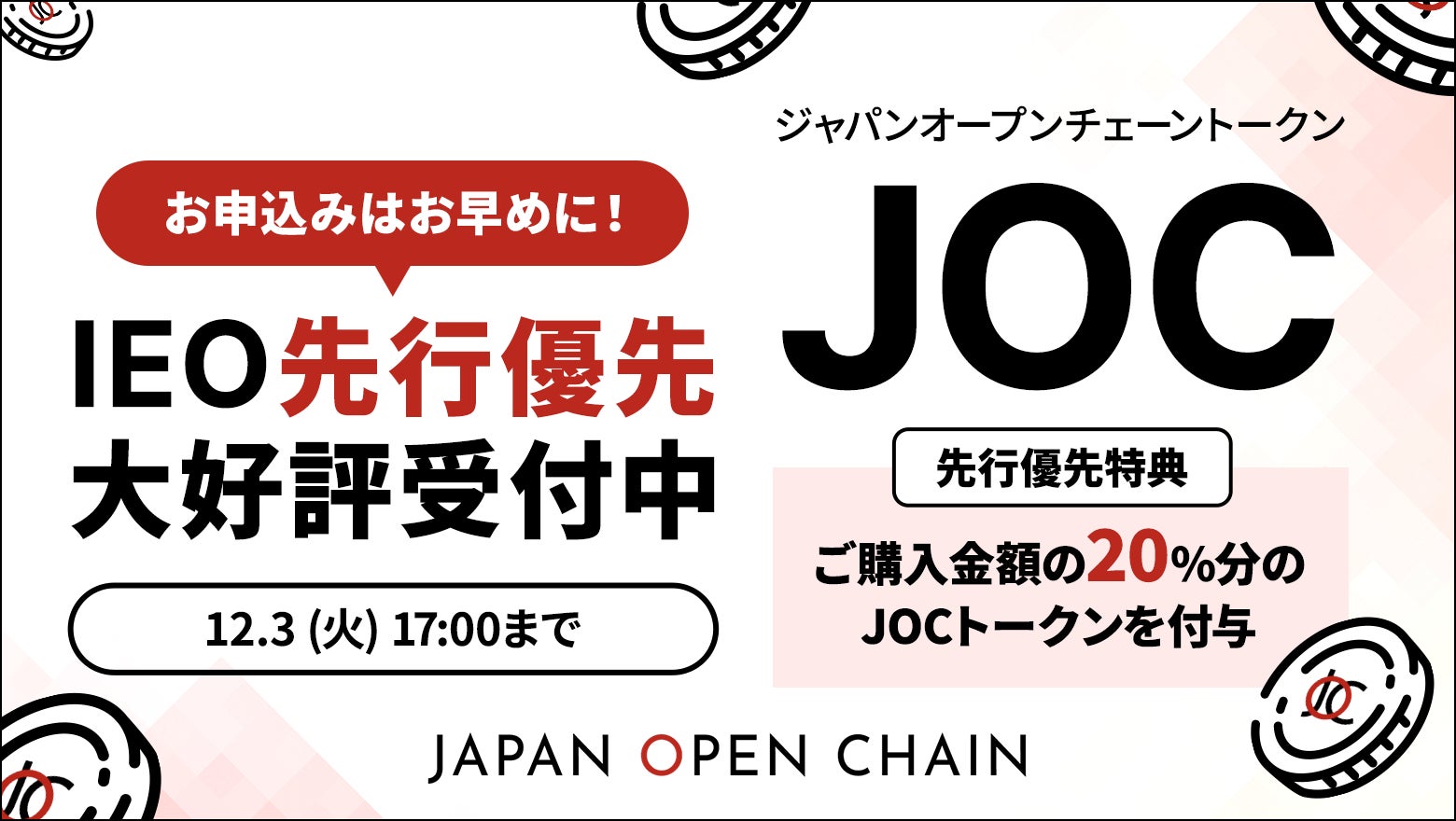 「Japan Open Chain(JOC)」のコンソーシアムを運営・管理する日本ブロックチェーン基盤株式会社(代表取締役:近藤 秀和、以下、当社)は、ビットトレード株式会社(本社:東京都港区、代表取締役社長:関 磊、以下「ビットトレード」)において、2024年11月20日(水)午前11時より開始した「ジャパンオープンチェーントークン(JOC)」のIEO大口先行優先販売について、申込初日に募集予定口数を大幅に突破したことをお知らせいたします。