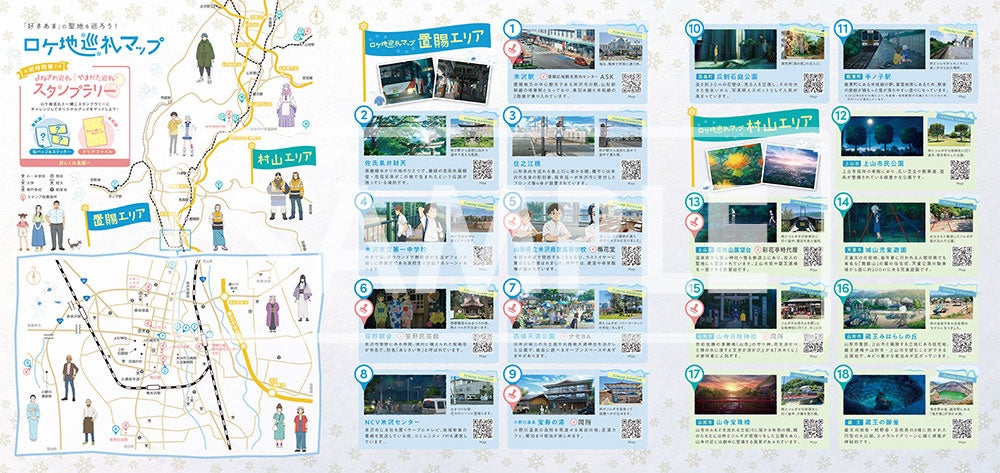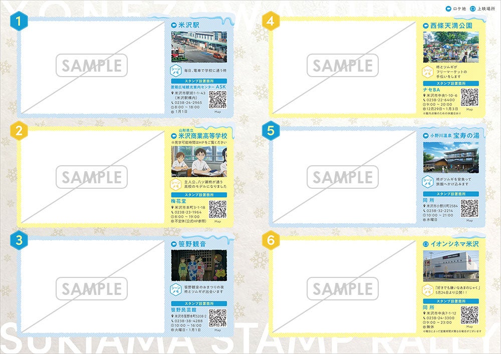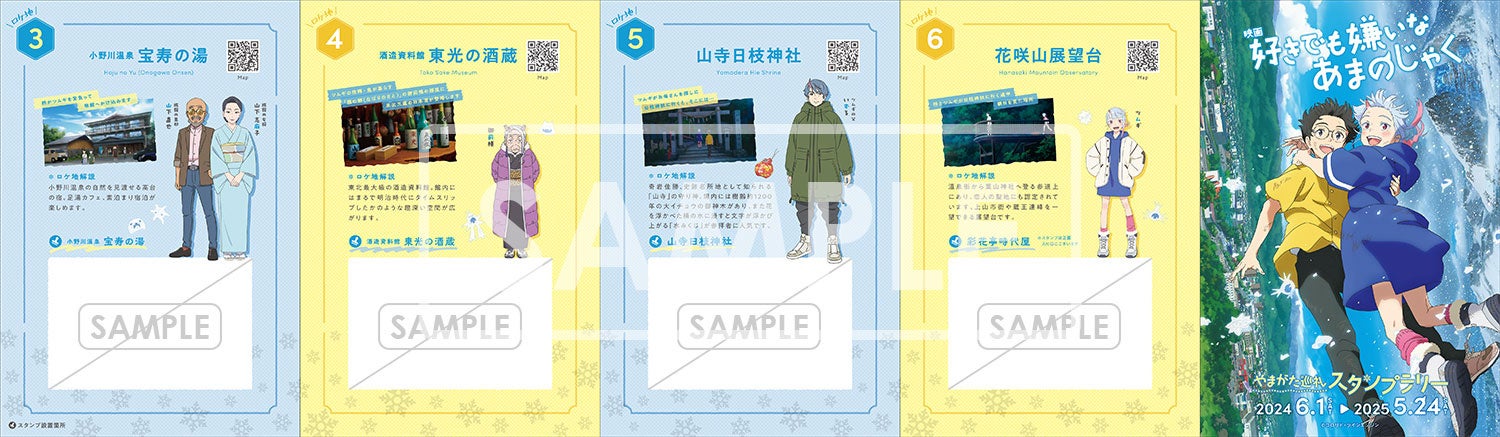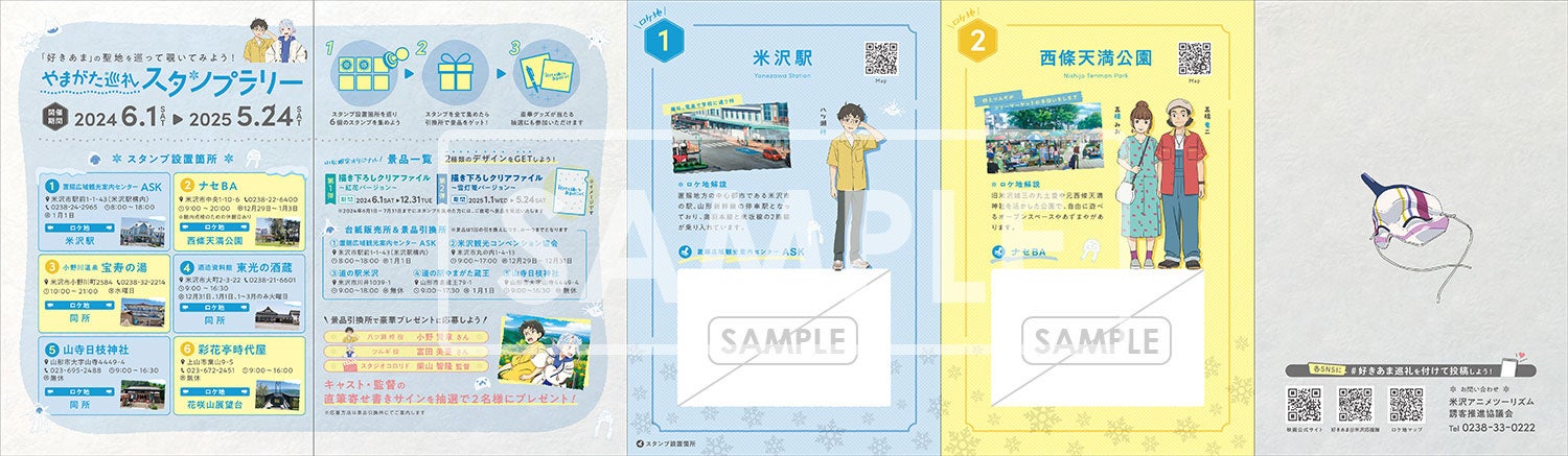 長編アニメーション映画「好きでも嫌いなあまのじゃく」の主人公「柊とツムギ」が旅した実際の場所を楽しく巡れるスタンプラリーは2種類あり、無料版は米沢エリア、有料版は米沢・上山・山形エリアを巡ります。無料版・有料版それぞれ、季節ごとに2~3種類の景品をご用意しております。