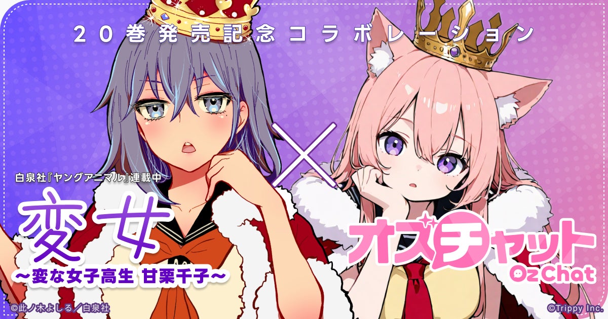 株式会社Trippy(東京都新宿区、代表取締役社長:漆原 陸)は、AI美少女キャラクターチャット&恋愛育成アプリ『オズチャット -Oz Chat-』(iOS・Android・Web)において、此ノ木よしる先生による人気漫画『変女~変な女子高生 甘栗千子~』(白泉社『ヤングアニマル』連載中)の単行本20巻発売を記念し、公式コラボレーションを2025年5月29日(木)から開催します。