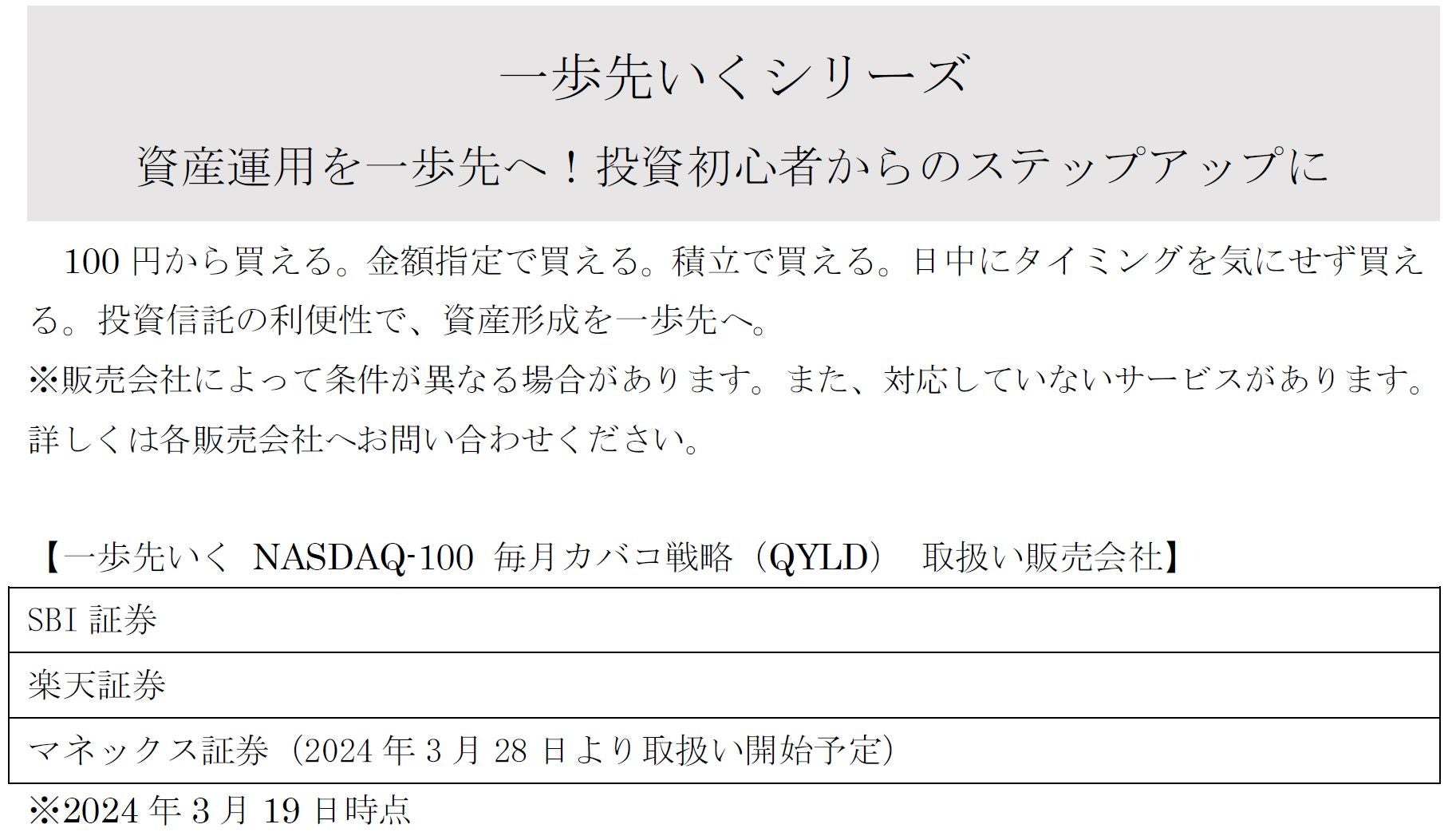 ▼プレスリリース 「一歩先いく NASDAQ-100 毎月カバコ戦略(QYLD)」設定のお知らせ