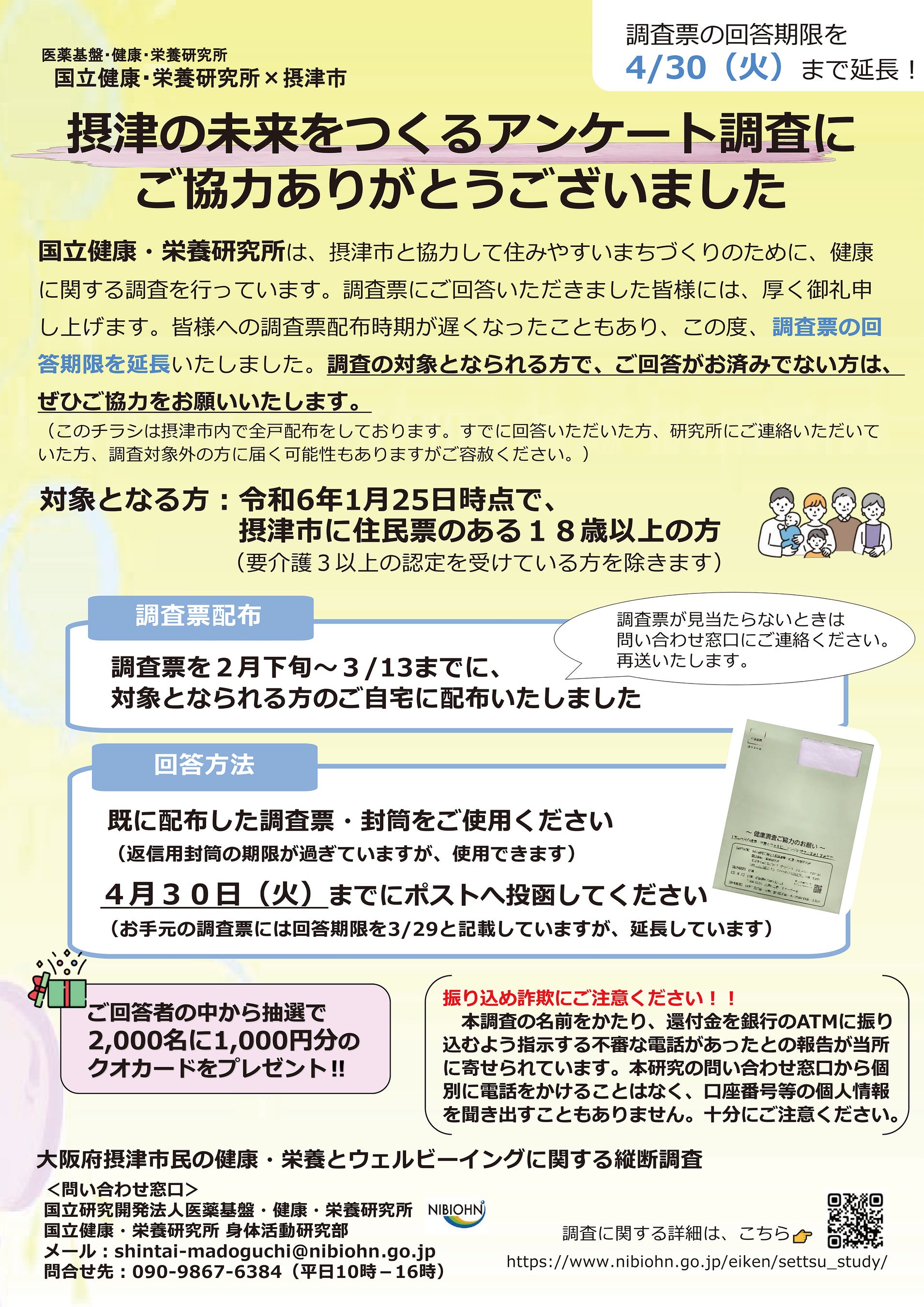 なお、摂津スタディの名前をかたり、還付金を銀行のATMに振り込むよう指示する不審な電話があったとの報告が当所に寄せられています。本研究の問合せ窓口から個別に電話をかけることはなく、口座番号等の個人情報を聞き出すこともありません。十分にご注意ください。