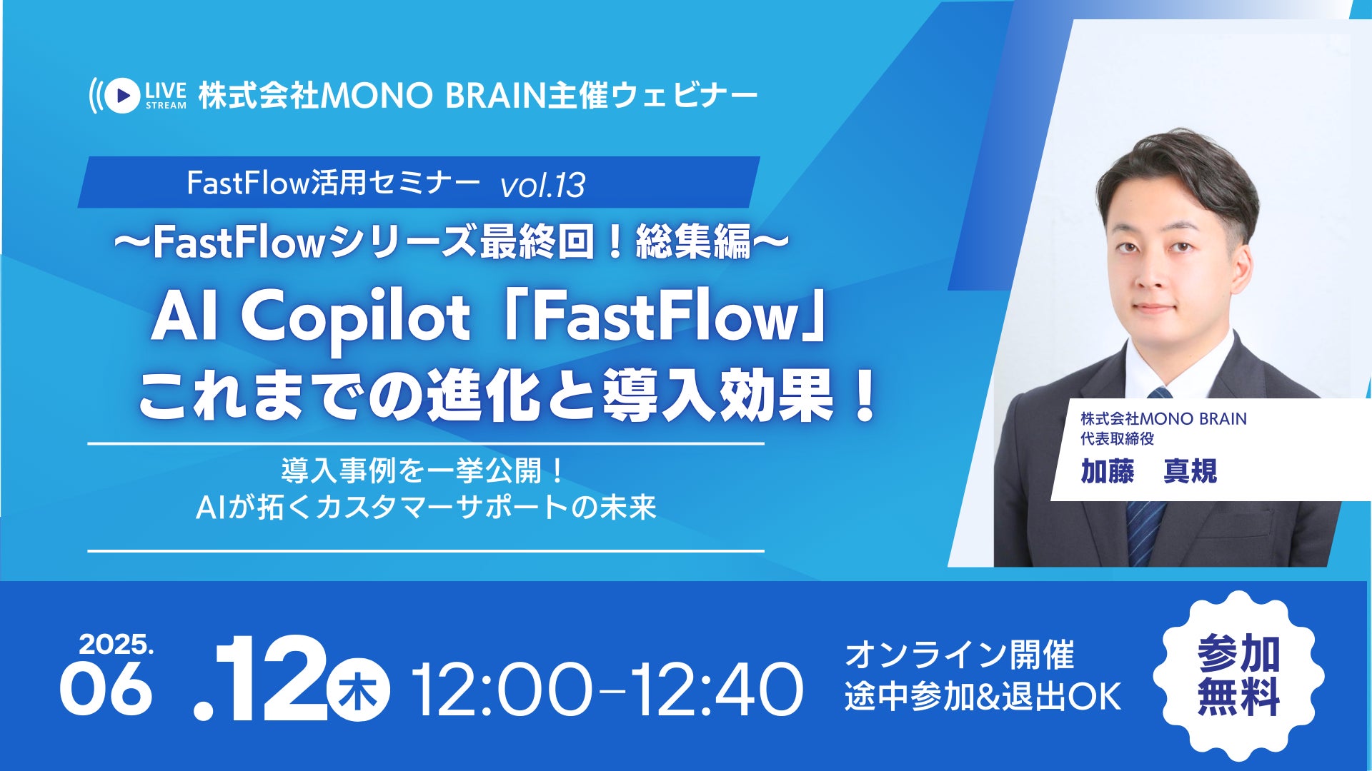 カスタマーサポート(CS)領域のAIソリューションを提供する株式会社MONO BRAIN(本社:東京都渋谷区、代表取締役:加藤真規)は、2025年6月12日(木)12時より、無料オンラインウェビナー「AI Copilot「FastFlow」シリーズ最終回!総集編ウェビナー (vol.13)」を開催いたします。