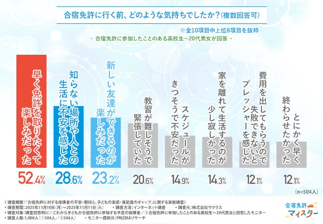 株式会社サクラス(所在地:東京都中央区、代表取締役:山本 謙介)は、①これから子どもが合宿免許に参加する予定の保護者/②合宿免許に参加したことのある高校生~20代男女を対象に、「合宿免許に対する保護者の不安・期待と、子どもの実感・満足度のギャップ」に関する実態調査を実施しました。