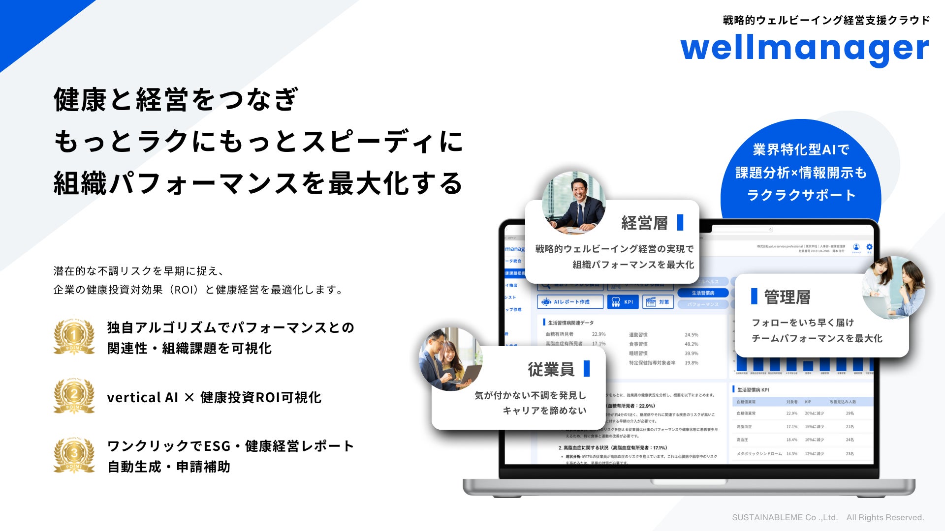 「wellmanager」を用いて健康投資のROI(投資対効果)を可視化することで、企業および従業員の健康管理の重要性に対する理解を促進し、市場の発展を目指します。
