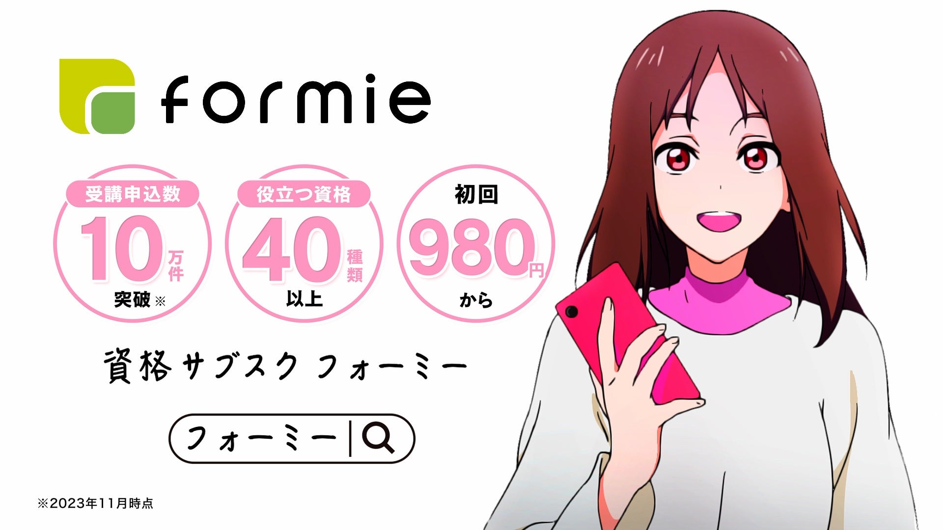 AMBIST株式会社が運営するformieは、40種類以上の中から好きな資格を選べ、誰でも手軽にスマートフォンやパソコンのweb教材だけで学べるオンライン資格取得サービスです。受講申込数は10万件(2023年11月時点)を突破し、多くの著名人にもご利用いただいております。