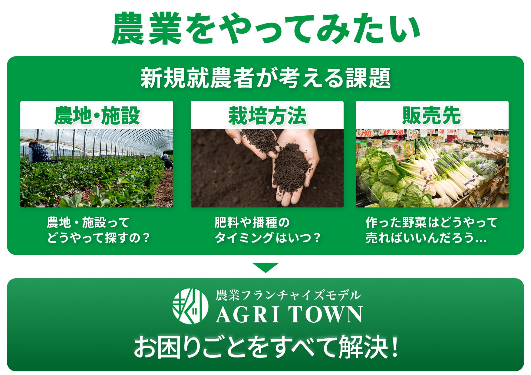 アグリタウンとは、農業への新規参入の課題を解決する農業のフランチャイズモデルです。