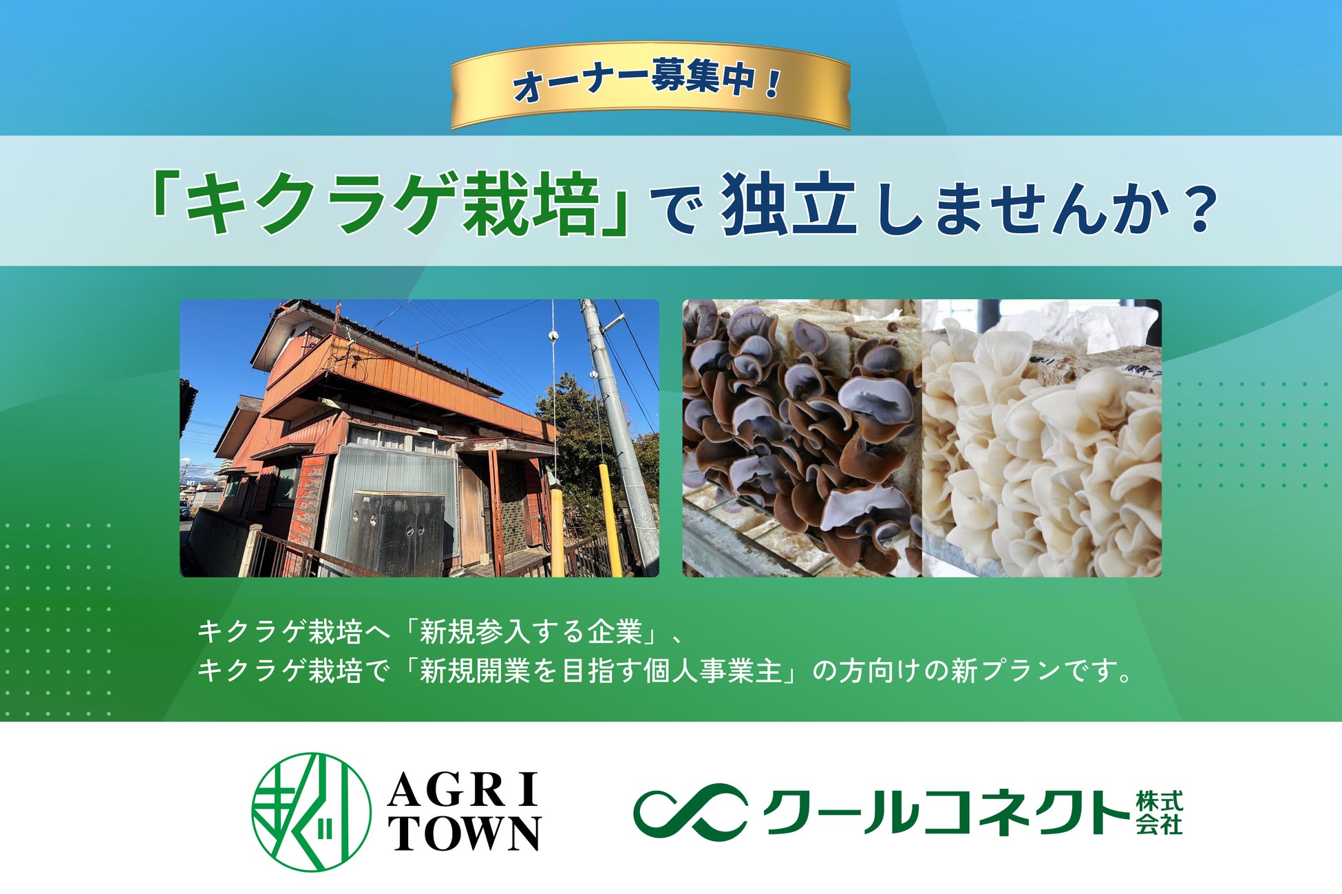 農業スタートアップのクールコネクト株式会社 (本社:群馬県伊勢崎市、代表取締役:神戸 翔太)は、この度、農業フランチャイズ「アグリタウン」で「キクラゲ栽培で独立プラン」を募集開始したことをお知らせします。アグリタウン公式HP https://nou-gyo.com/