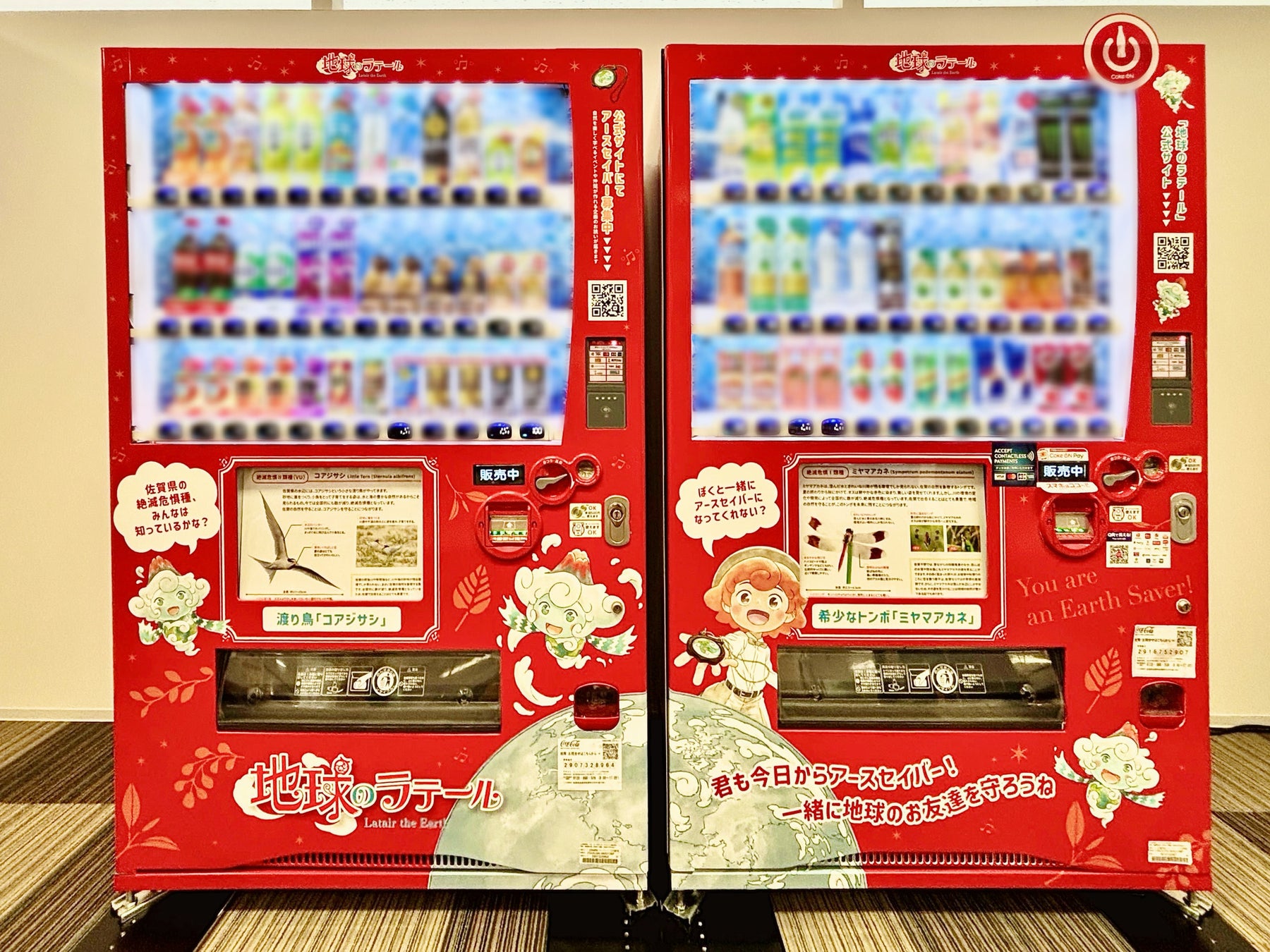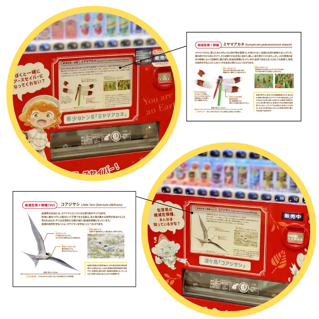 「アースセイバー自販機」第一弾として、佐賀県佐賀市のショッピングセンター「モラージュ佐賀」に設置し、佐賀県の絶滅危惧種であるコアジサシとミヤマアカネを紹介しています。