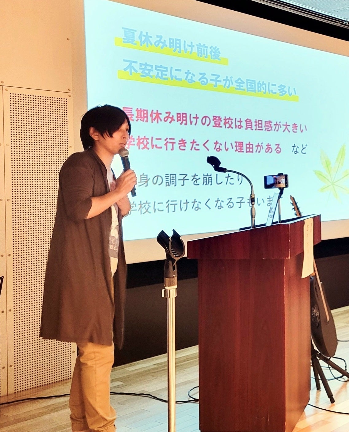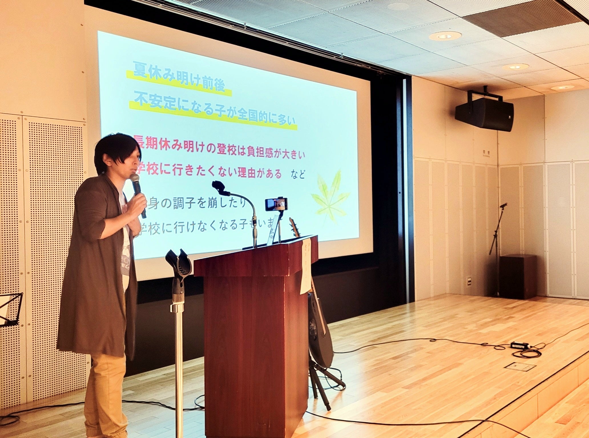 前半は、我孫子市出身のシンガーソングライター悠々ホルンさんによる講演。10代の時に2度の自殺未遂を経験した悠々ホルンさんより、自身の体験やこれまで8,000通を超える手紙やメールを通じて受け取った当事者の声をもとに、子ども目線から夏休み明けの不安について語られた。