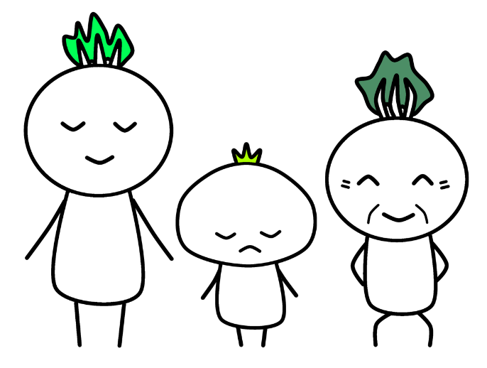 (イラスト)動画のキャラクター 左から親カブ、子カブ、ご近所さん