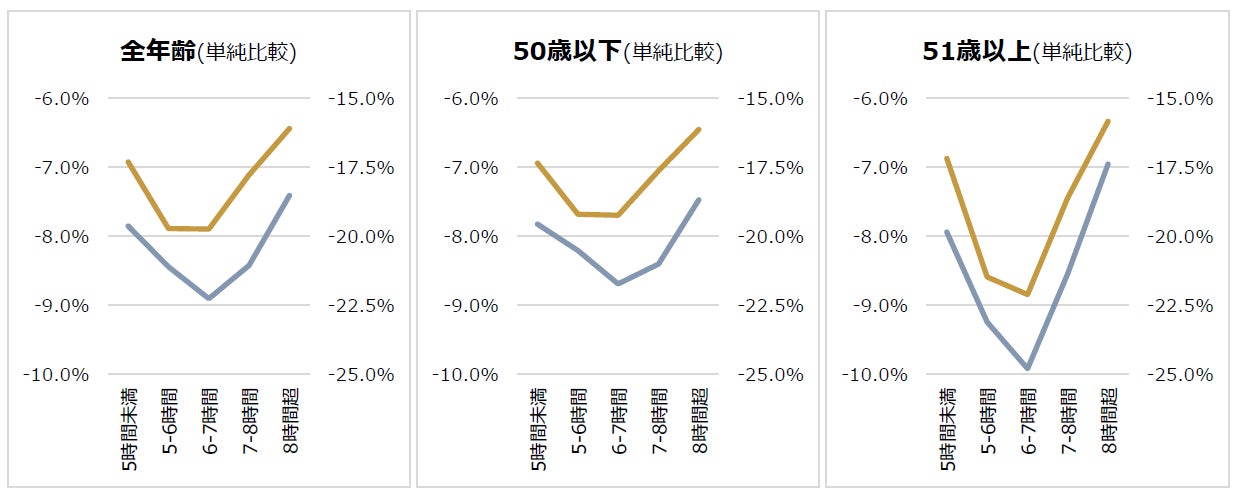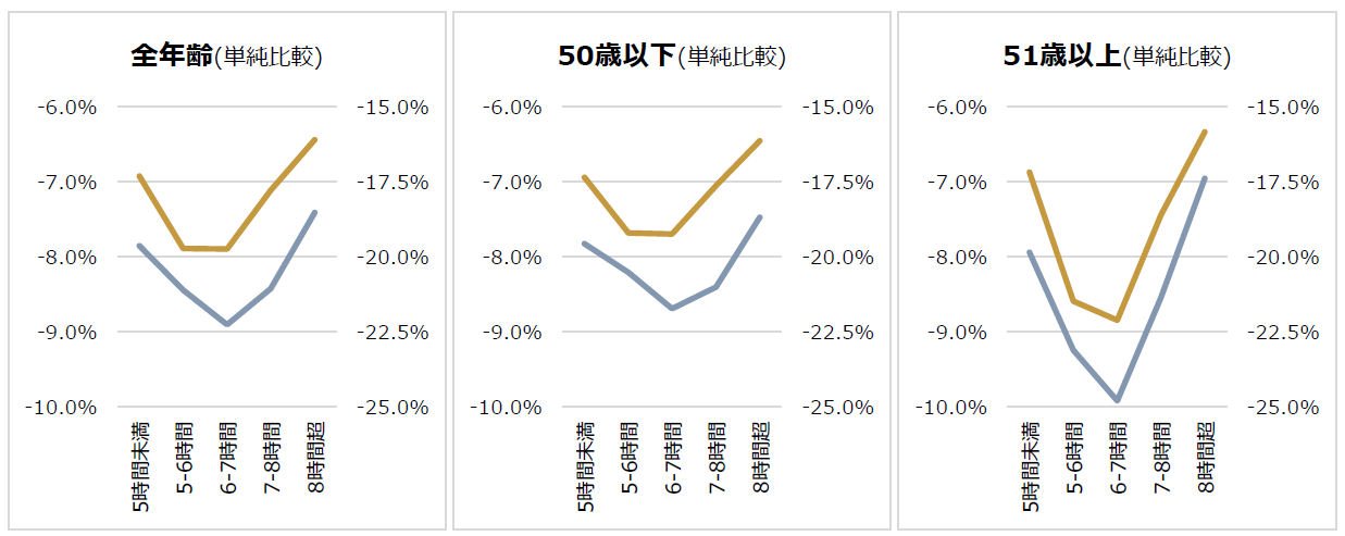 ②50歳以下:睡眠不足・睡眠過多の両方、特に5時間未満および8時間超の睡眠時間は減量効果を損なう