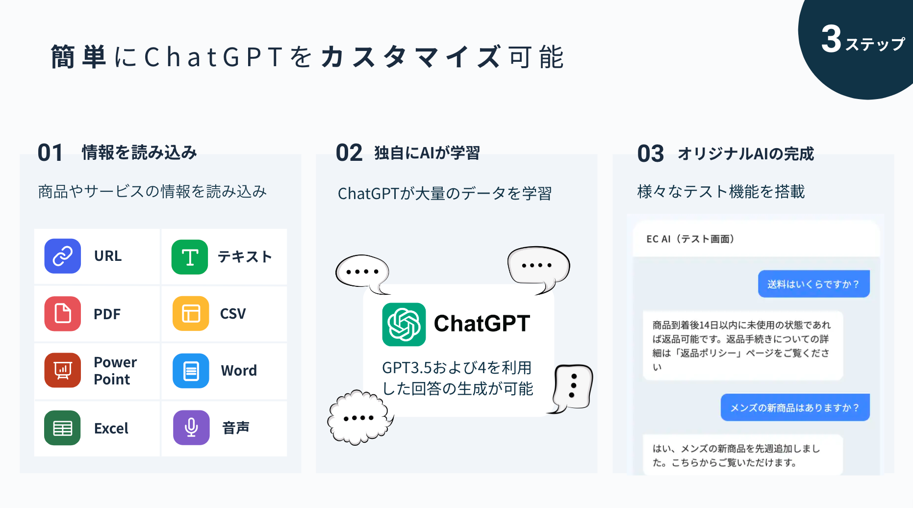 それを解決するのがQuup AIです。Quup AIでは様々なデータをChatGPTに学習させて、独自のChatGPTを作成することができます。