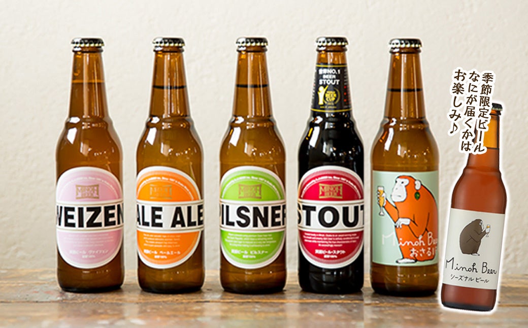 箕面ビール定番のピルスナー、ヴァイツェン、スタウト、ペールエール、おさるIPA、シーズナルビール各1本をそろえたお楽しみ6本セットです。