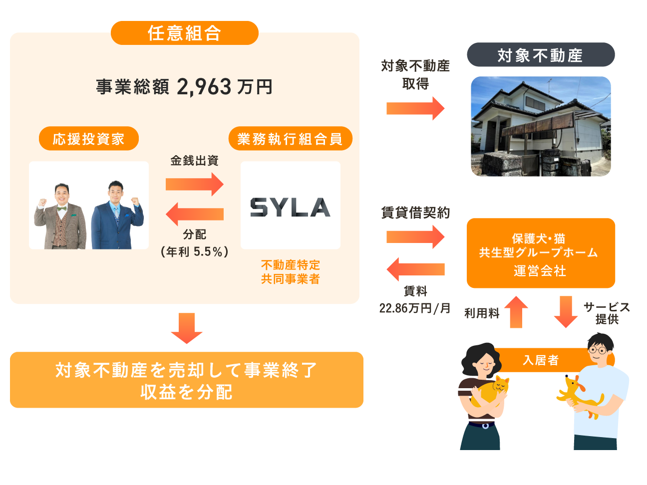 本ファンドは、株式会社スペースエージェント(本社:東京都港区、代表取締役社長CEO:紙中 良太)が物件提供を行い、株式会社エスグランド(本社:埼玉県吉川市、代表取締役:菅原 浩樹)が利回りくんへ出展。株式会社アニスピホールディングス(本社:東京都千代田区、代表取締役社長:藤田 英明)が企画として手掛ける保護犬・猫 共生型グループホーム「わおん」シリーズです。