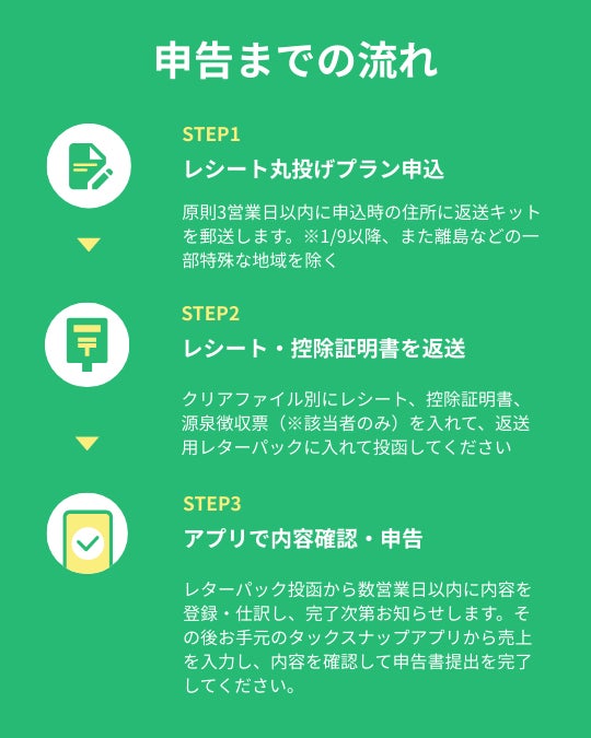 レシート丸投げプランは累計確定申告書サポート実績2万件以上を誇る「タックスナップ」が、”レシートをためている人”がお手軽に確定申告を終えられるように「郵送」を起点として作成した新プランです。