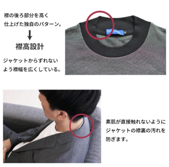 素肌が直接ジャケットにふれて汚れないよう、独自の襟高設計を施すとともに、ジャケットがずれないよう襟幅も広い仕様に。