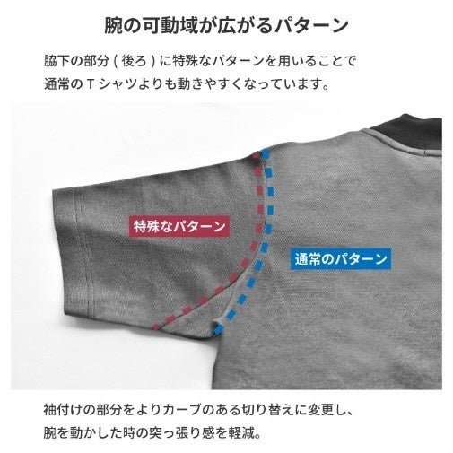 脇下部分(後ろ)に特殊なパターンを用いることで、通常のTシャツよりも可動域が広がり動きやすく、腕を動かした際の突っ張り感を軽減。
