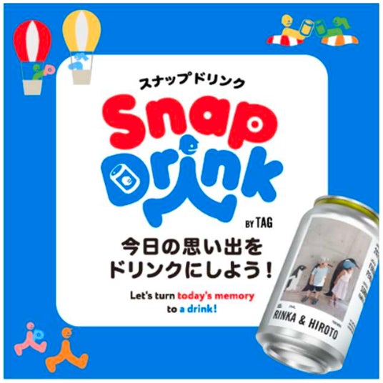 Snap Drink(スナップドリンク)は、自分で撮った思い出の写真を その場で缶飲料のラベルにできるサービスです。複雑な登録は必要 なく、写真とテキストをアップロードするだけでオリジナルラベル がすぐに完成。作成した日付と場所も入り、飲んだ後はステッカー としてもお楽しみいただけるサービスです。