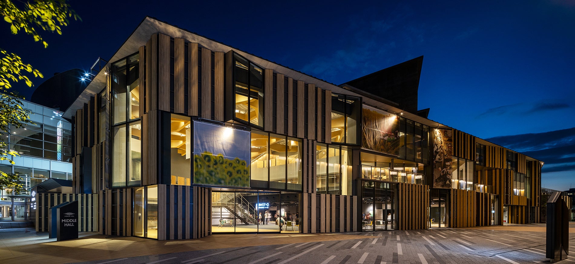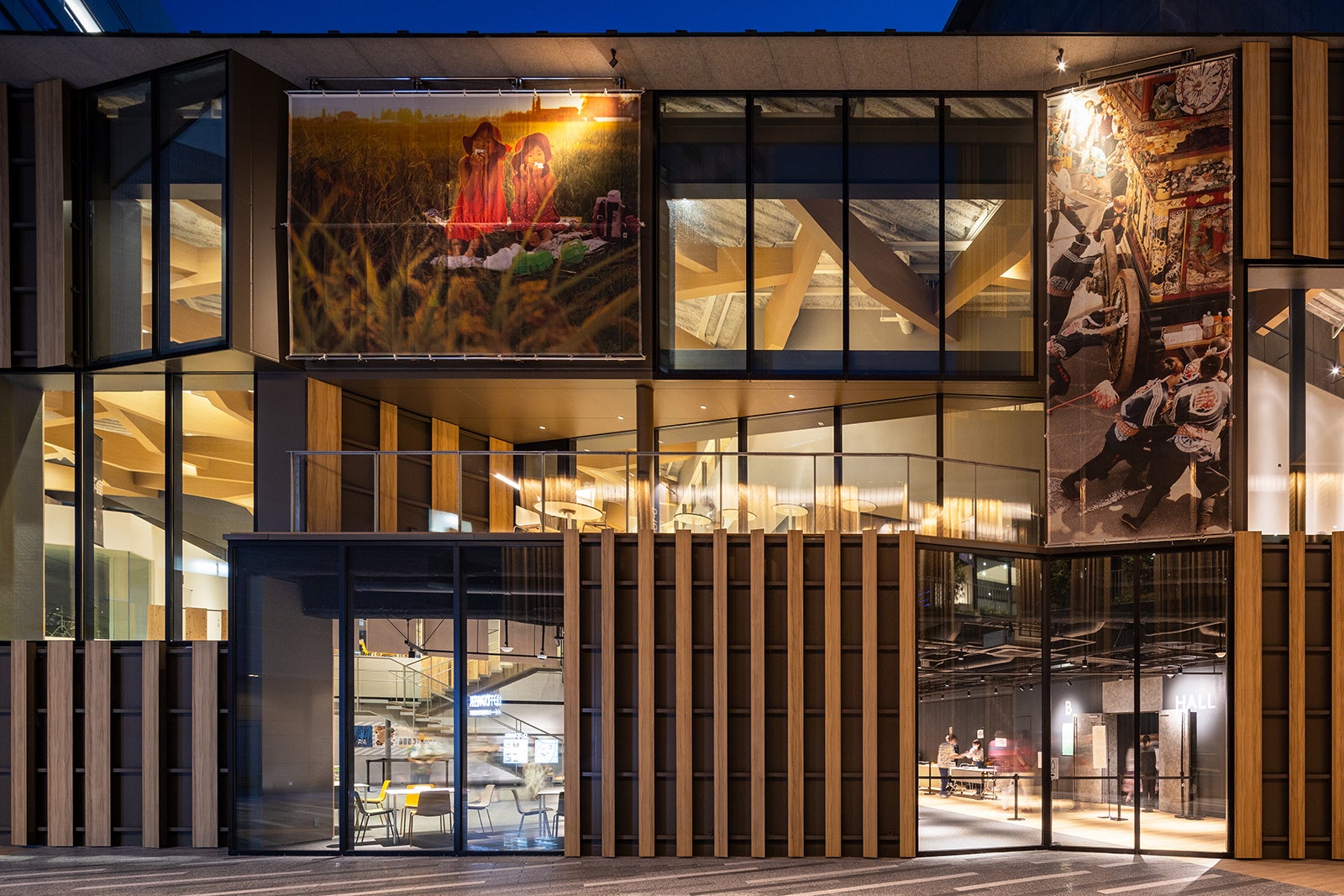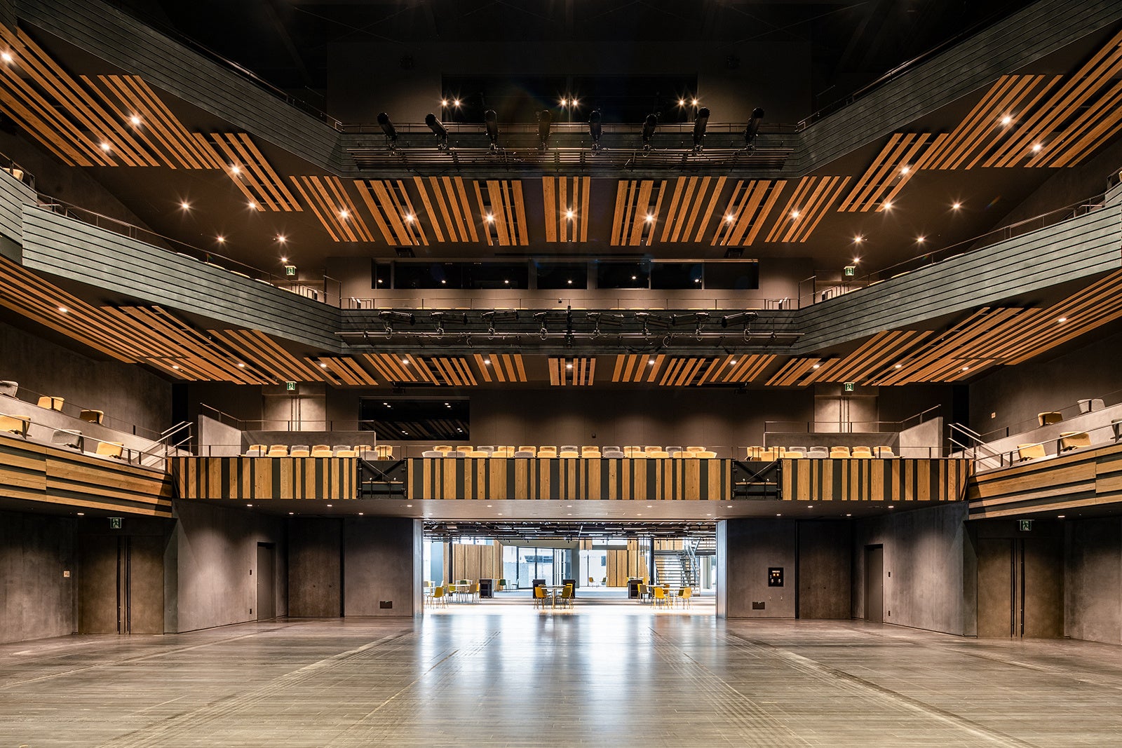 市民利用と演劇に主軸を置いたブラックボックス型の中ホールを整備することで、大ホールと連携し、さらに多様な芸術文化に親しむ機会を提供することを目的として計画された。私たちは芝居小屋特有の演者のリアルな息使いや緊張感が客席へ伝わり、観客の熱気に演者が包まれるような圧倒的な一体感のあるホールがつくれないか考えた。本施設は652席でありながら三層のサイドバルコニーで構成した多層客席としており、全国に類がない個性あるホールとなっている。段床型の客席はワゴン客席と移動観覧席を採用により平土間化でき、固定ブリッジと道具バトンを客席まで設けることで、自由に舞台位置が設定可能となり、様々な利用要望に対応可能なホールとなっている。また平土間利用時、客席後部の移動間仕切りを開く事でホワイエと一体利用可能となり、更に建物ファサードを開く事でキャニオンストリートとの一体利用も可能となる。