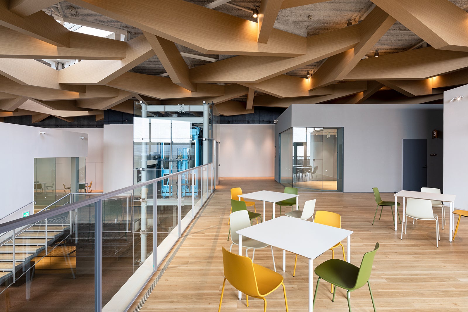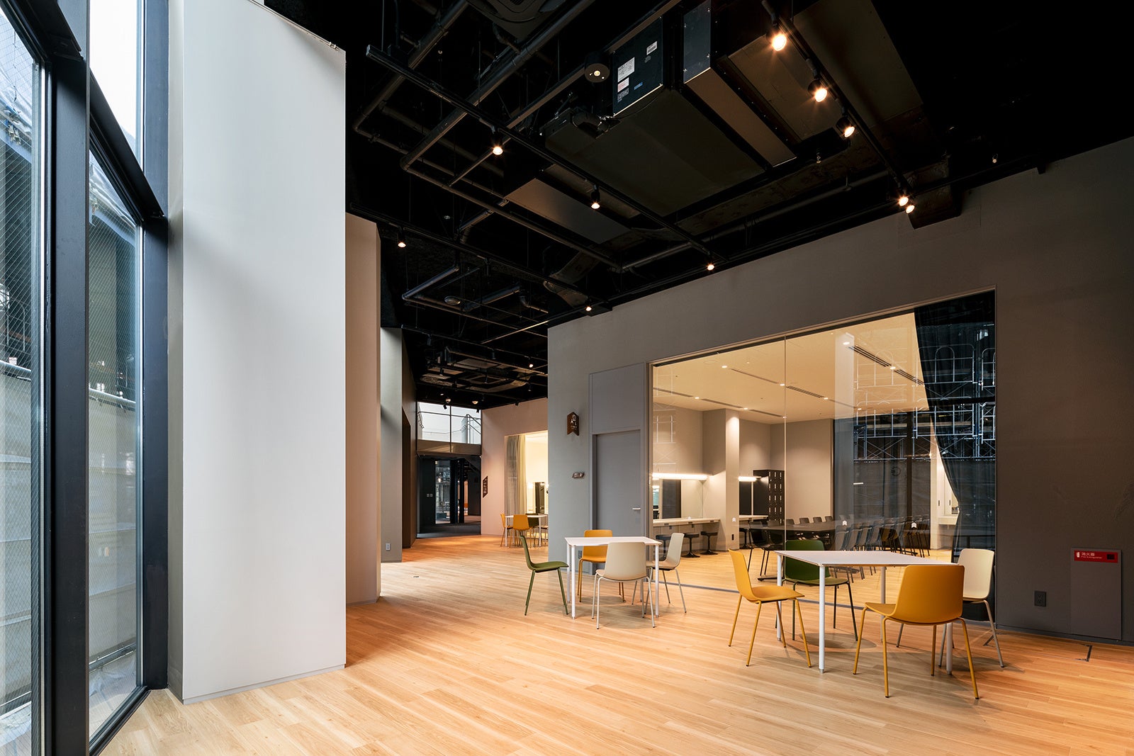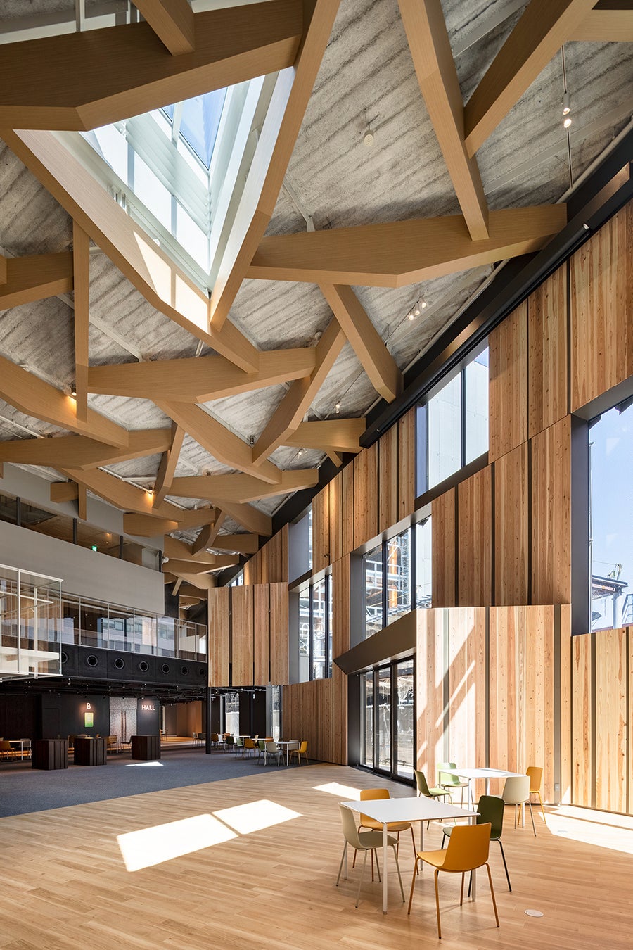 中ホールの共用部をつくるにあたっては日常的に開かれ市民の文化活動が活性化されると同時に、地域の広場となり街に賑わいを生み出す施設を目指した。東西南北 のあらゆる方向からアクセスできるよう各所に出入口を設け、誰もが気軽に訪れることのできる開かれた施設とした。また2層吹抜のワンルームの内部空間には、東・北・西面に多く設けた開口部やトップライトからの自然光が溢れる開放的な空間とすることを目指した。その空間の各所にはテーブルと椅子を配置し市民の居場所を確保した。また楽屋、練習室等の各諸室は大きなガラス壁でロビーに開放的なつくりとし、「見る/見られる」の関係により文化活動が活性化することを意図した。加えて文化活動が見えることで施設の賑わいが増すとともに、見ることを楽しみに集う人々が増え、施設の集客性も高まると考えた。