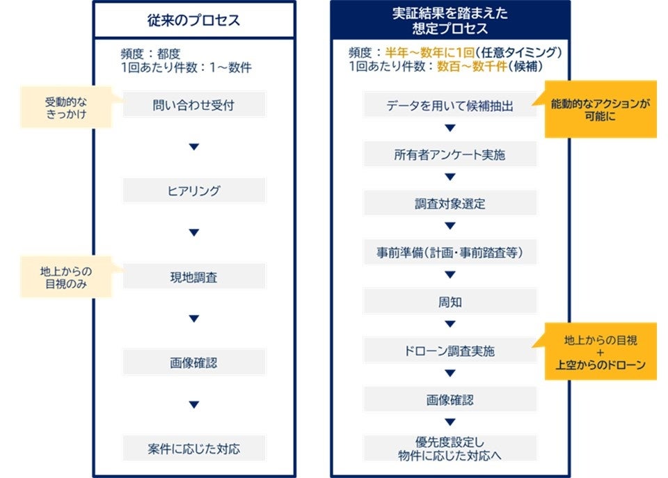 本実証で新たに設計した空き家調査プロセス(下図)では、これまで実施していた、問い合わせの都度、調査員が現地を訪れ空き家調査をする方法と異なり、自治体が能動的に空き家調査を行うことが可能です。
