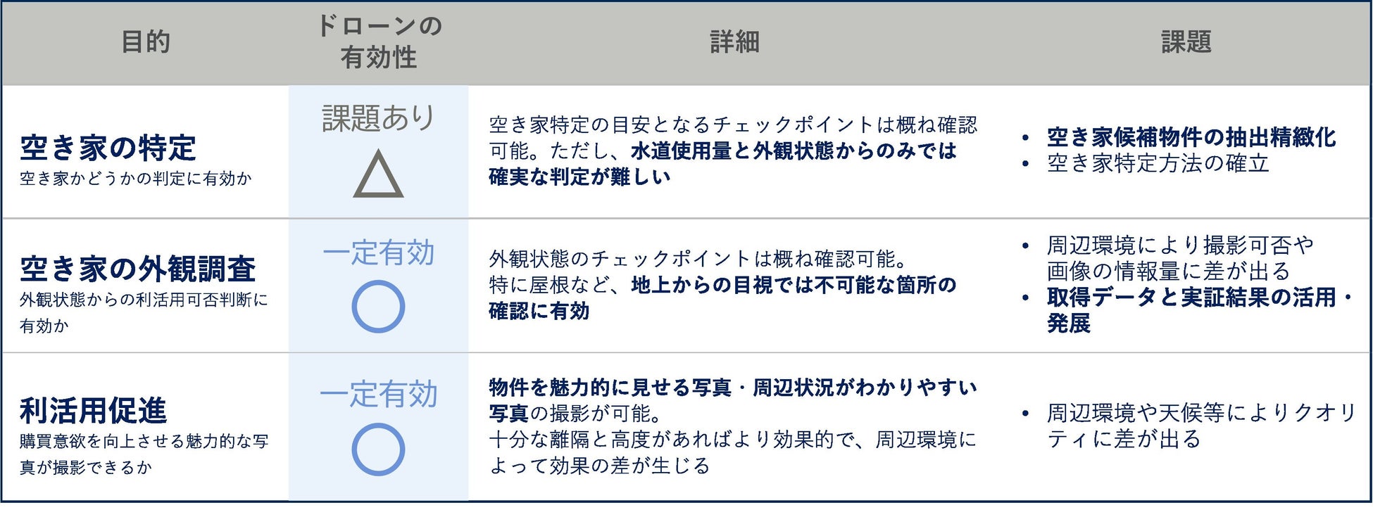 本実証の結果、ドローンによる空き家の特定については、特定空家判断基準、空き家判断基準、利活用可否判断に有効と思われるチェックリストにおいて、それぞれ半数程度の項目について判定が可能であり、目視の一定の代替が可能といえる結果が導かれました。一方で、地上からの視点や現地でないと確認できない項目に対しては、現状では人による調査が必要と判明しました。