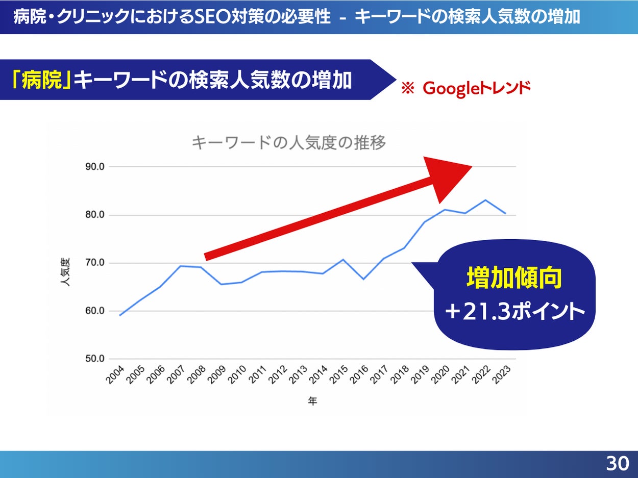 これは、Google内で「病院」というキーワードを検索し、病院に関連するサービスの提供者を探しているユーザーが多いことを示しています。この傾向は今後も続き、病院関連のキーワードは引き続き安定した検索ボリュームを維持すると見込まれます。