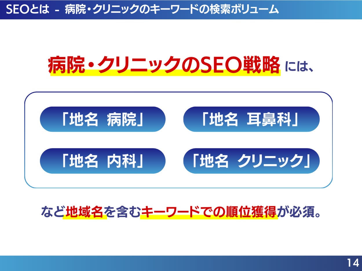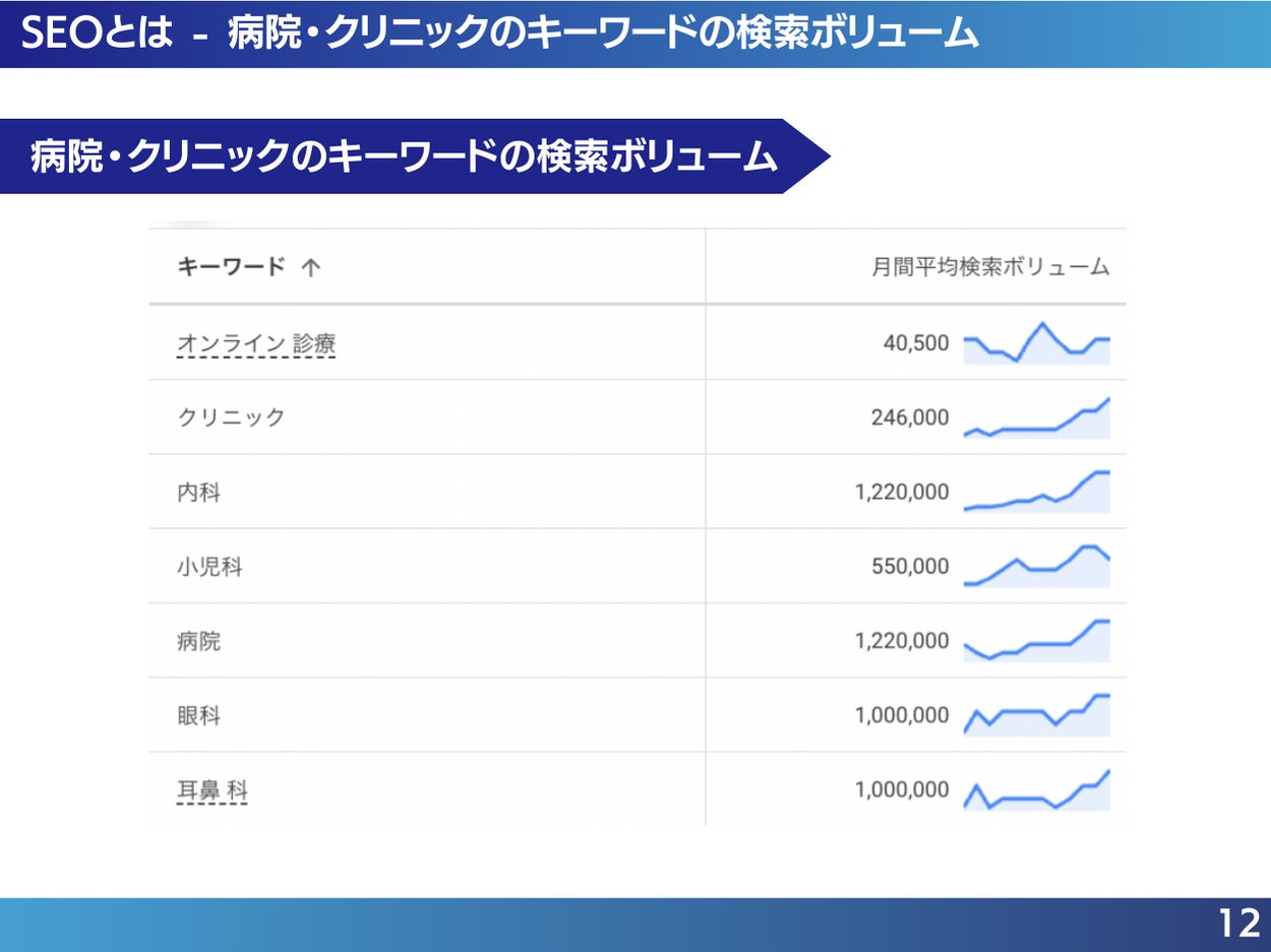 保険診療業界における、ユーザーの検索キーワードの月間平均検索ボリュームや対策するべきキーワード、検索順位と集客数の関係について理解を深め、正しいSEO対策を行いましょう。