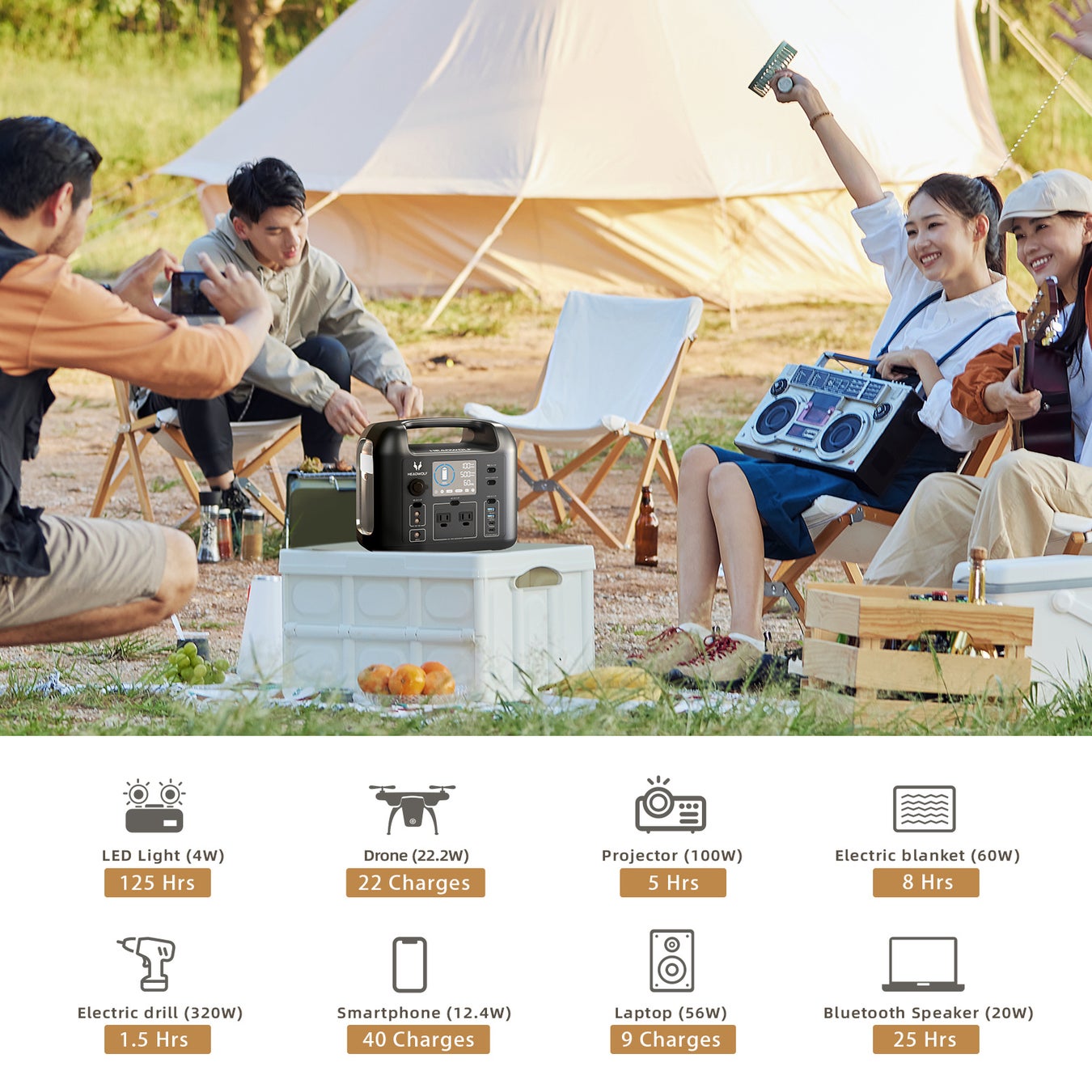 大容量を持つため、キャンプや車中泊、屋外での家庭用電源として使用することができます。キャンプから災害時の備えまで、幅広い状況で使用することができます。HEADWOLFポータブル電源D500は、最大500Wの電力でデバイスを駆動し、多くの機器やデバイスと使用することができます。ノートパソコン(56W)約9回分、ドローン(22.2W)約22回分、スマートフォン(12.4W)約40回分、電気毛布(60W)約8時間使用することができます。ポータブル電源はすべての電気機器と互換性があるわけではありませんので、ご了承ください。製品には消費電力よりも大きな起動電力が必要な場合があります。