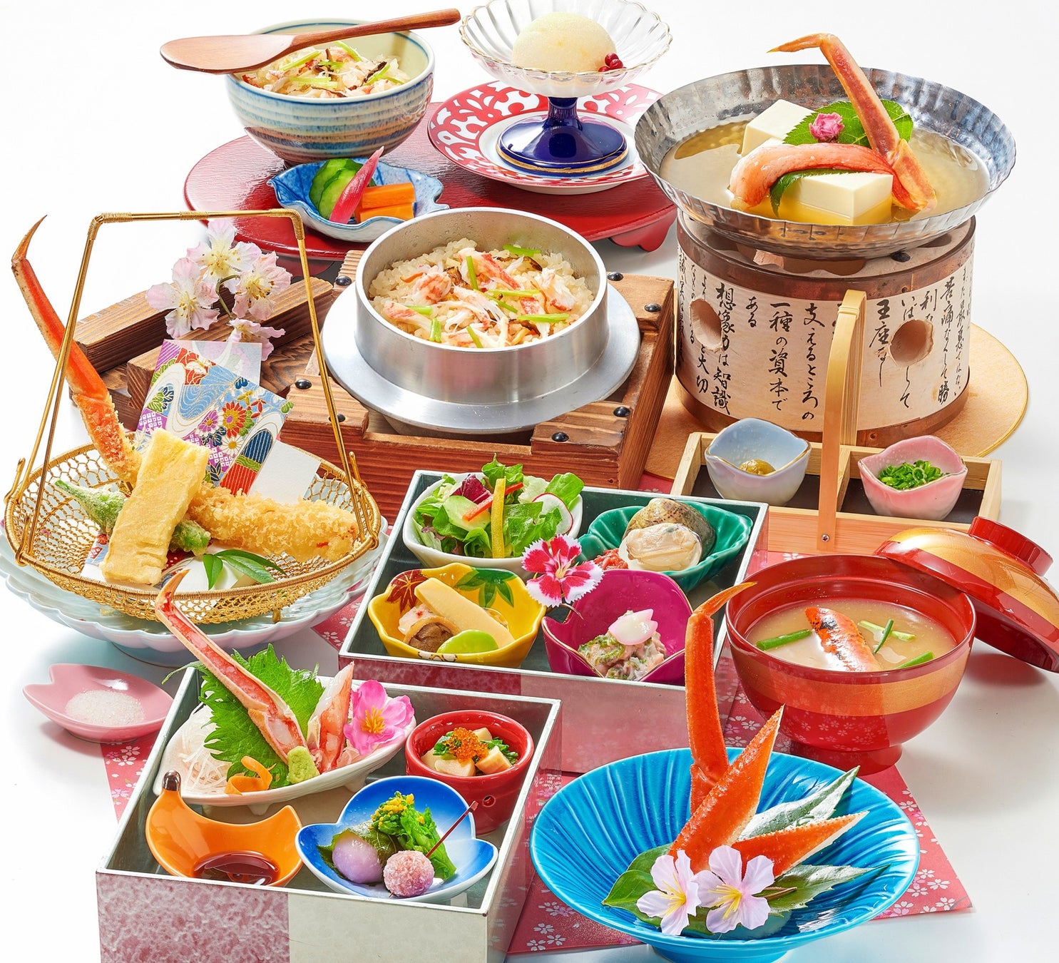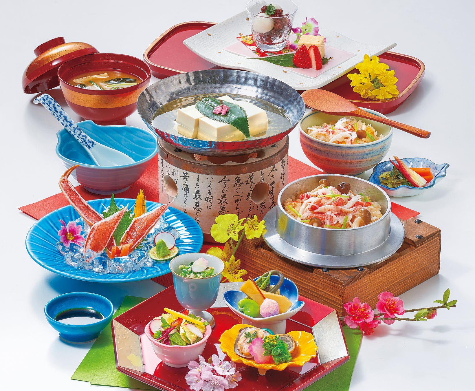 内容:かにと桜豆富の小鍋・かに釜めし・春の二段重・茹でがに・かに天ぷら・お椀・香の物・デザート
