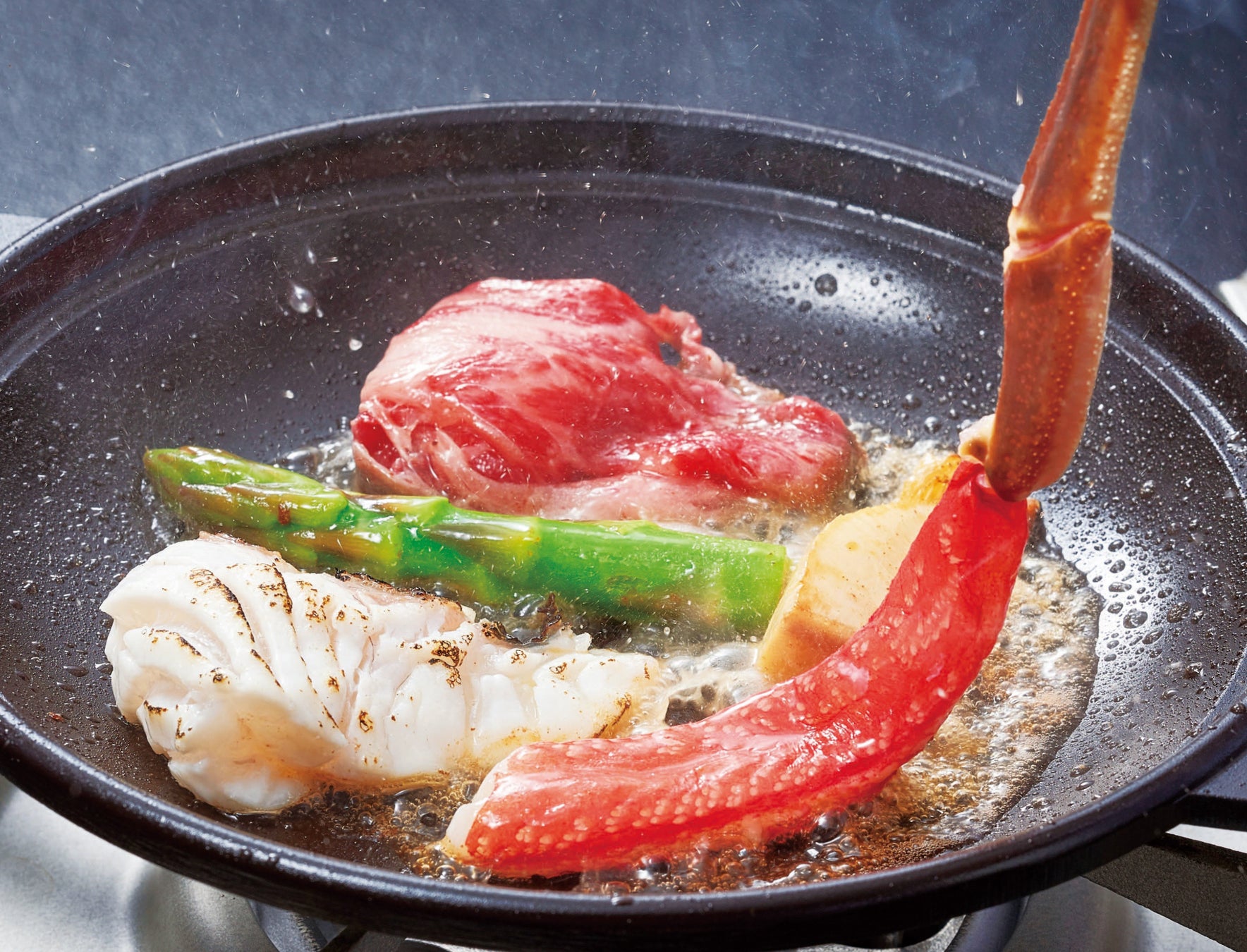 ずわい蟹や桜鯛、国産牛などを熱々の陶板の上でしゃぶしゃぶの様にさっと焼き上げることにより、食材の旨みが一層引き立ちます。