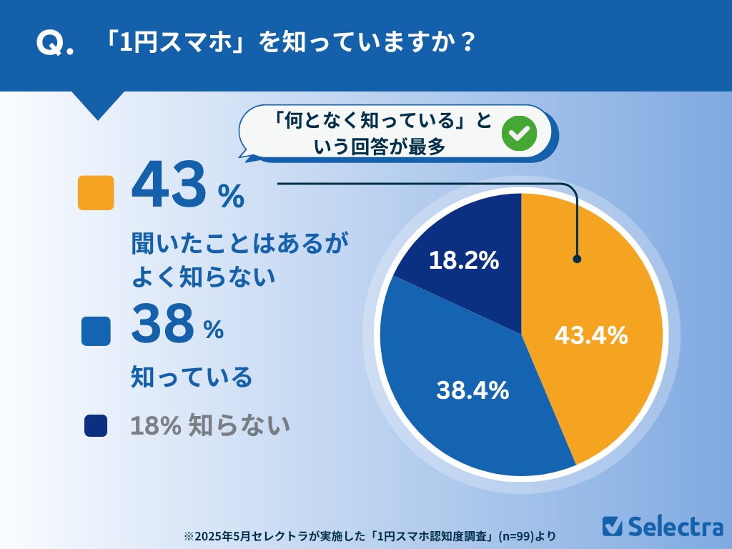 ✅「1円スマホは聞いたことはあるけど、よく知らない」という答えが全体の43%で最多
