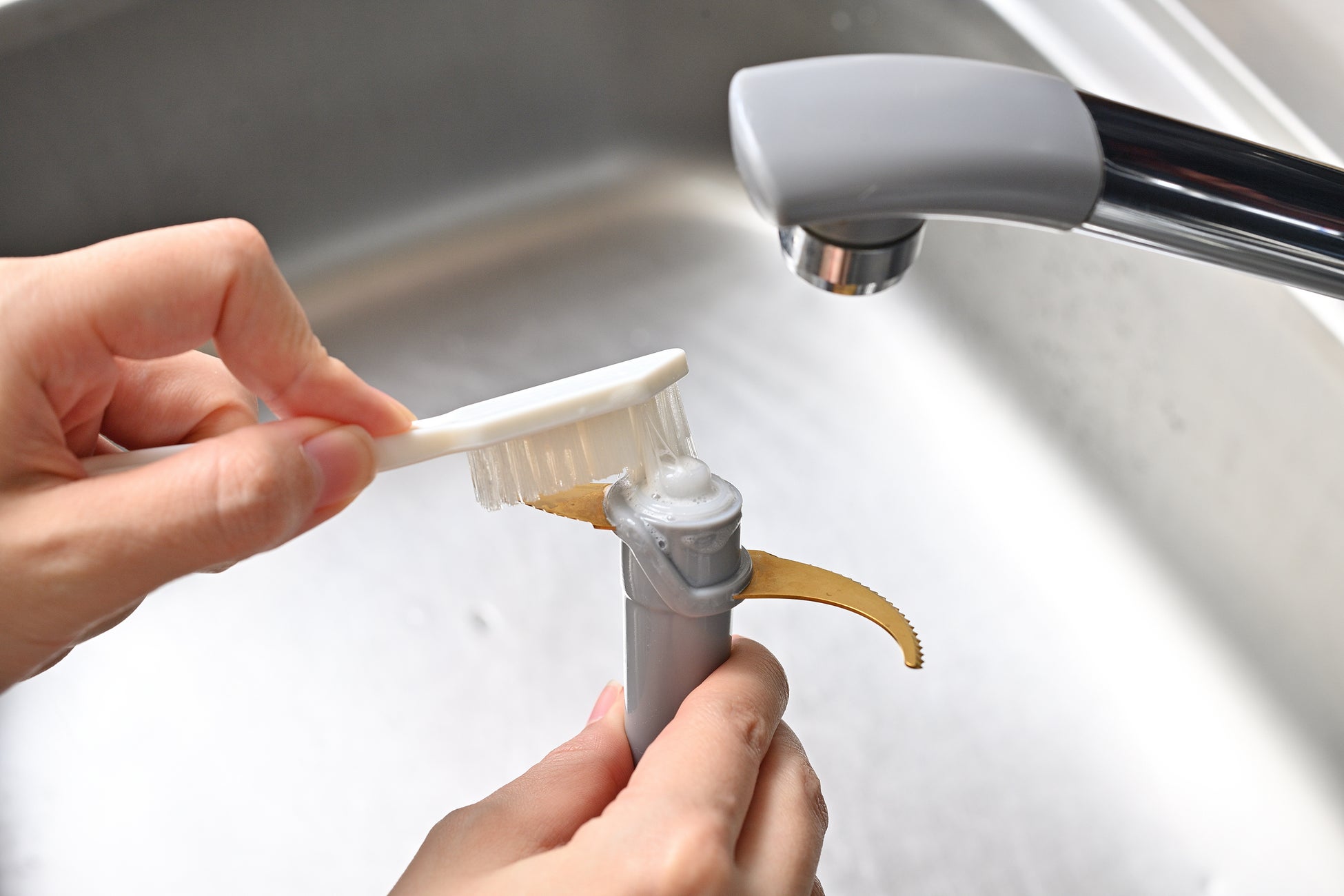 みじん切りブレード、両⾯おろしプレート、フタ、シリコンゴムは⾷器洗い乾燥機の使⽤も可能です。⼿洗いでも簡単にお⼿⼊れできるよう、専⽤のお⼿⼊れブラシが付属しており、各パーツを清潔に保つことができます。