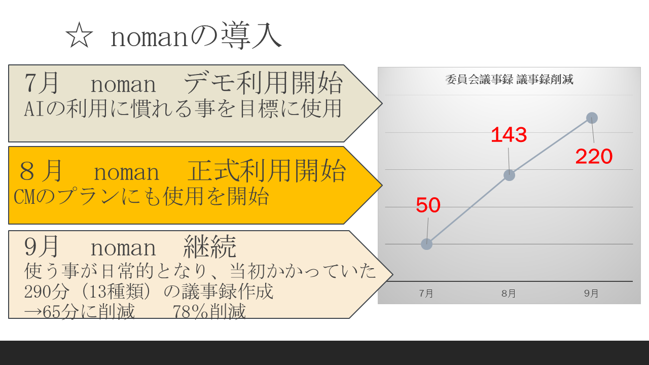 noman導入前後で時間を測定したところ、議事録作成に要する時間の短縮が明確に確認された。