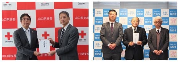 マルキュウグループ山口県内店舗および関連事業所、マルミヤストア、新鮮市場、アタックス全店にて14,683,371円の義援金が寄せられました。多くのお客様より寄せられた救援金につきましては、当社からの義援金を合わせ、計16,500,000円を日本赤十字社 山口県支部及び佐伯市役所(大分)に寄託いたしました。今後、日本赤十字社を通じて、被災地へお届けいたします 。