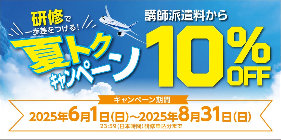 ANAビジネスソリューション株式会社(本社:東京都大田区/代表取締役社長:植野 素明)は、キャンペーン期間中に2025年9月30日(火)までに実施する講師派遣型研修を新規でお申し込みいただいた企業・団体様を対象に、講師派遣料を10%割引いたします。