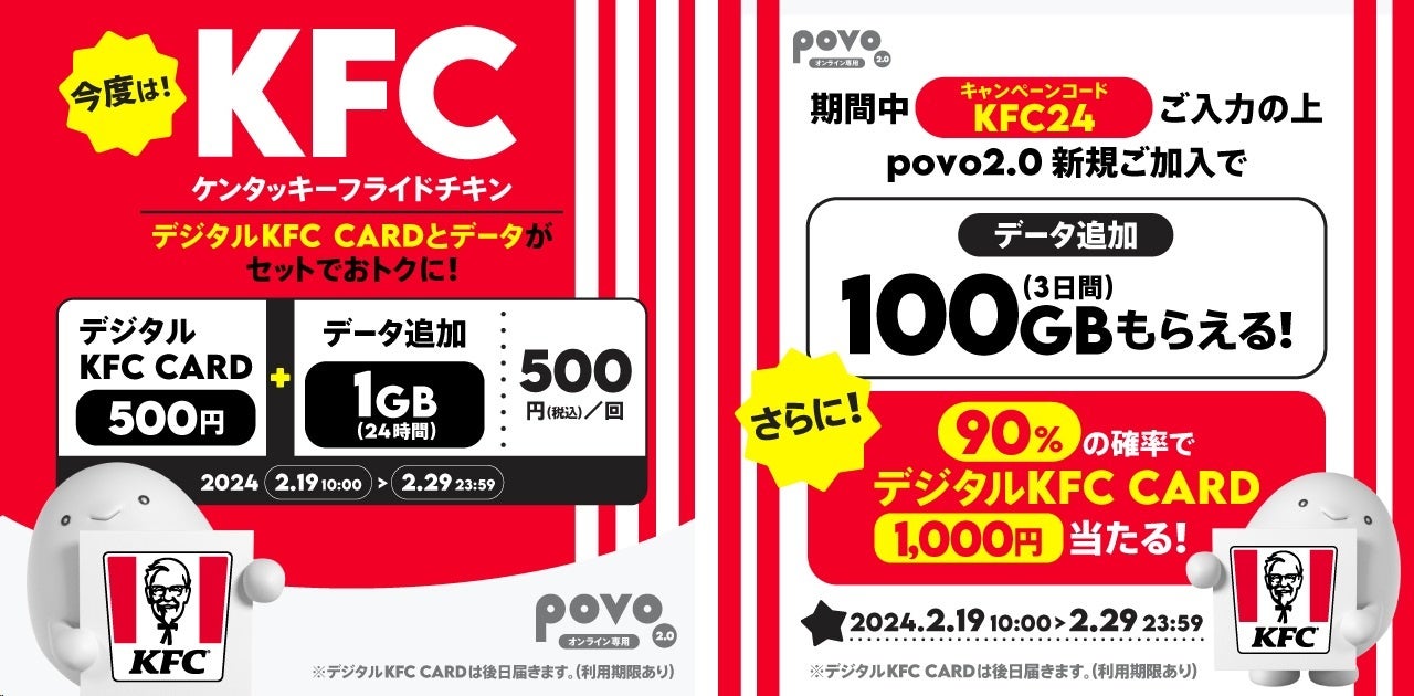 また、2月29日までのpovo2.0新規加入で、100GB(3日間)が必ずもらえるほか、抽選で90%の確率(注)で 「デジタルKFC CARD 1,000円」があたるキャンペーンを開催します。