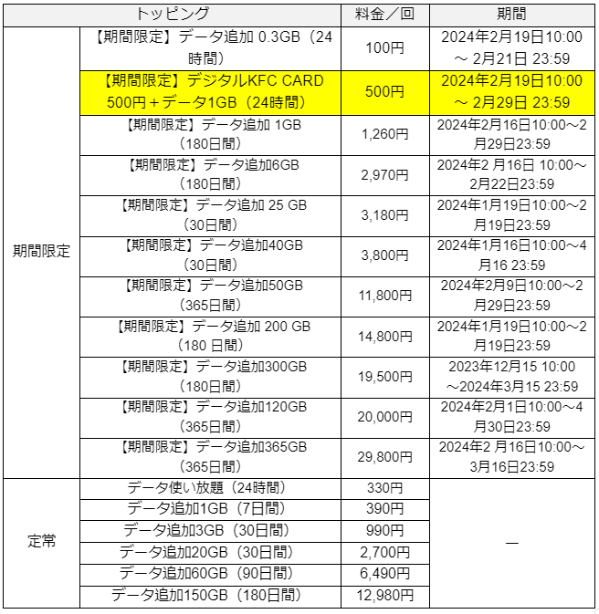 【期間限定】デジタルKFC CARD 500円+データ1GB(24時間) | 500円 | 2024年2月19日10:00~ 2月29日23:59 |