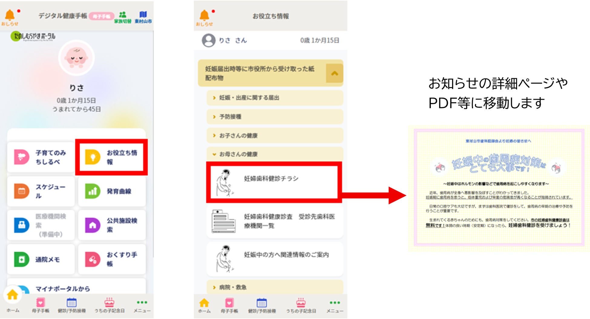 利用者の皆様の妊娠週数や月齢等に応じて、自治体の子育て支援制度等、必要な情報を電子版母子健康手帳内でのプッシュ配信やメールで毎月お届けします。