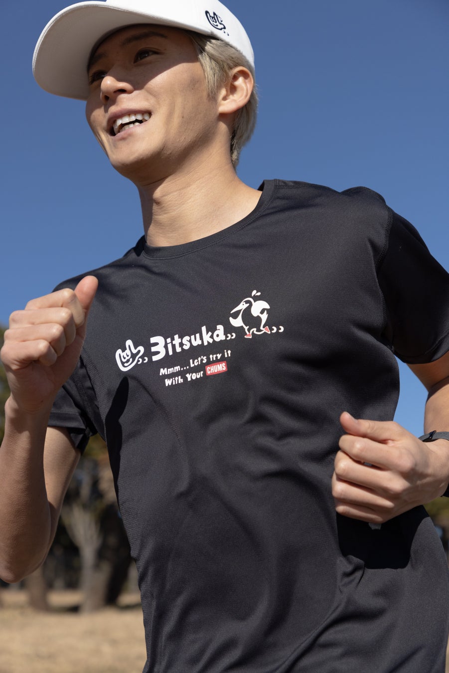 ランナーとして、そしてインフルエンサーとして進化を続ける 三津家貴也さん とのコラボレーションアイテム。3itsukaのアイコンとCHUMSのマスコット「ブービーバード」を組み合わせた、シンプルかつユニークなグラフィックデザイン。ブービーバードが三津家さんの代名詞をポーズとともに表現し、あそびゴコロをプラスした特別な一枚に仕上げました。肌の摩擦を抑えるフラットステッチを採用し、長時間のランニングでも快適な着心地に。縫い目を背中側に配置し、腕振りの摩擦軽減設計。